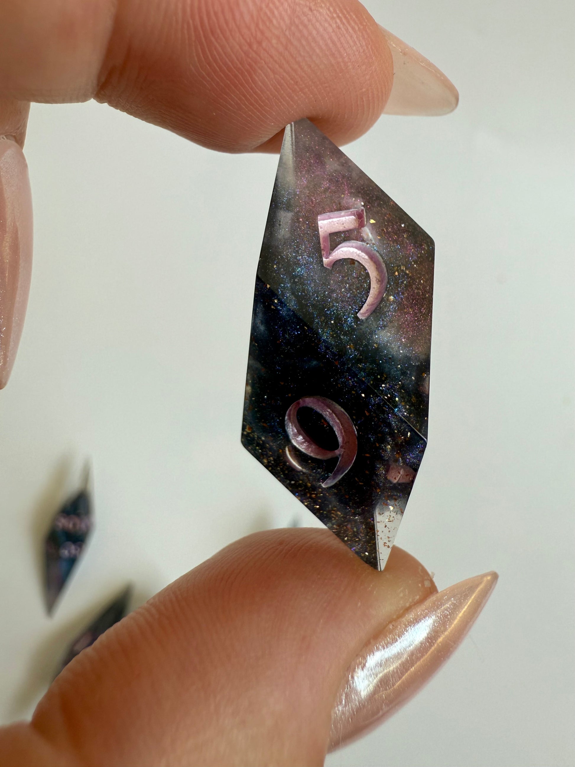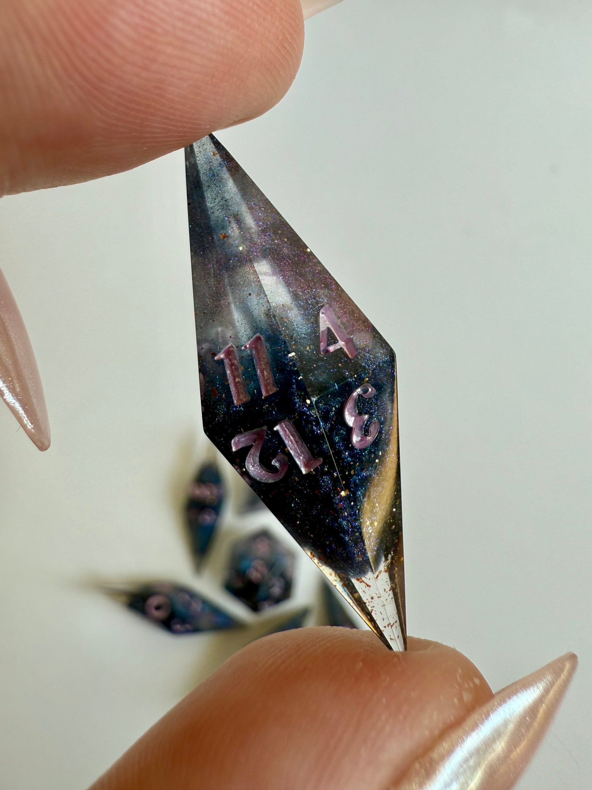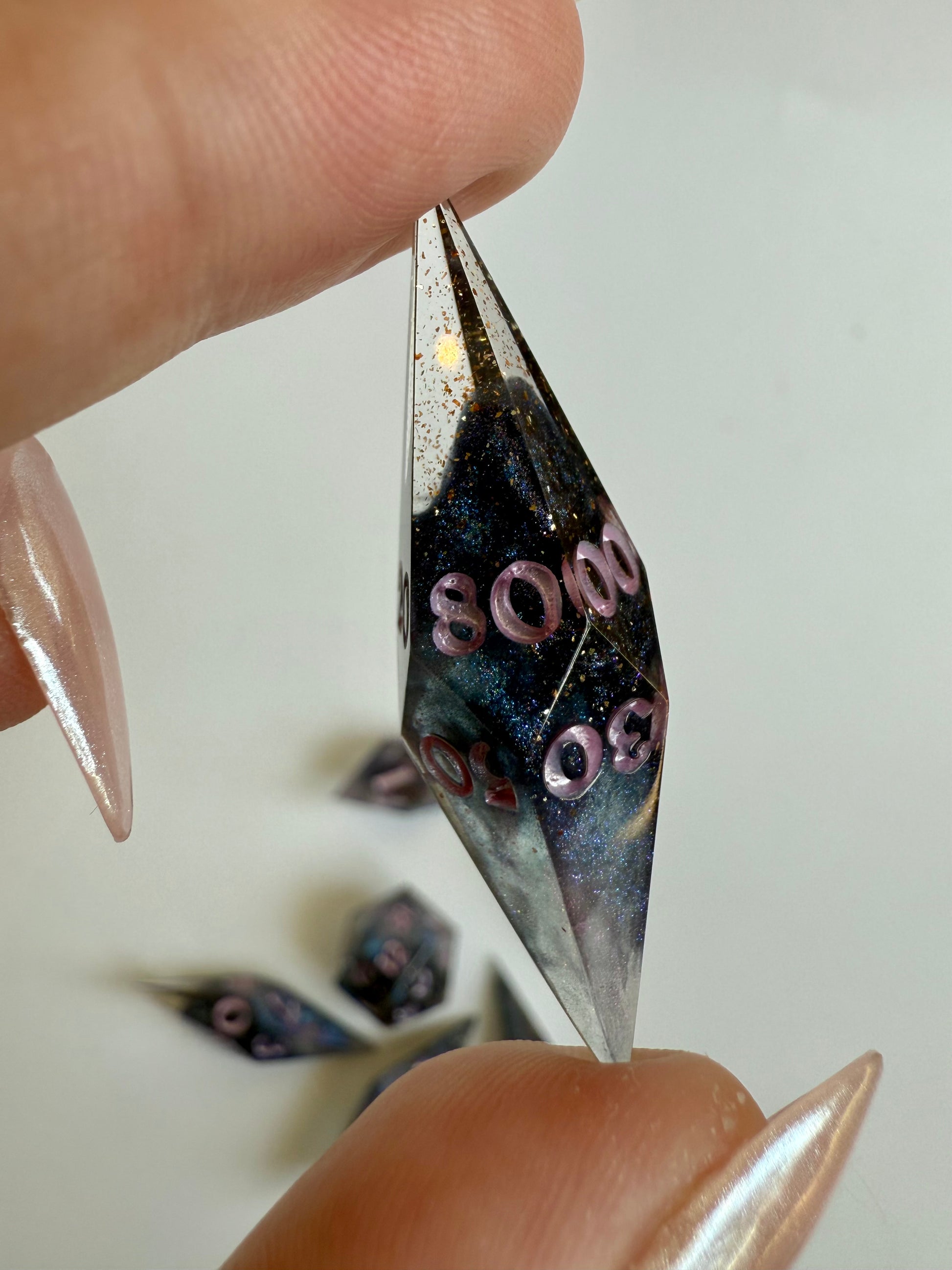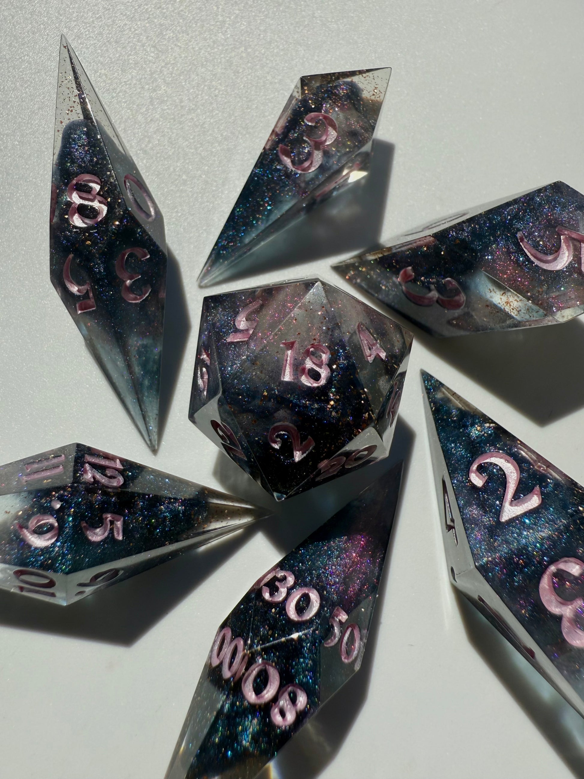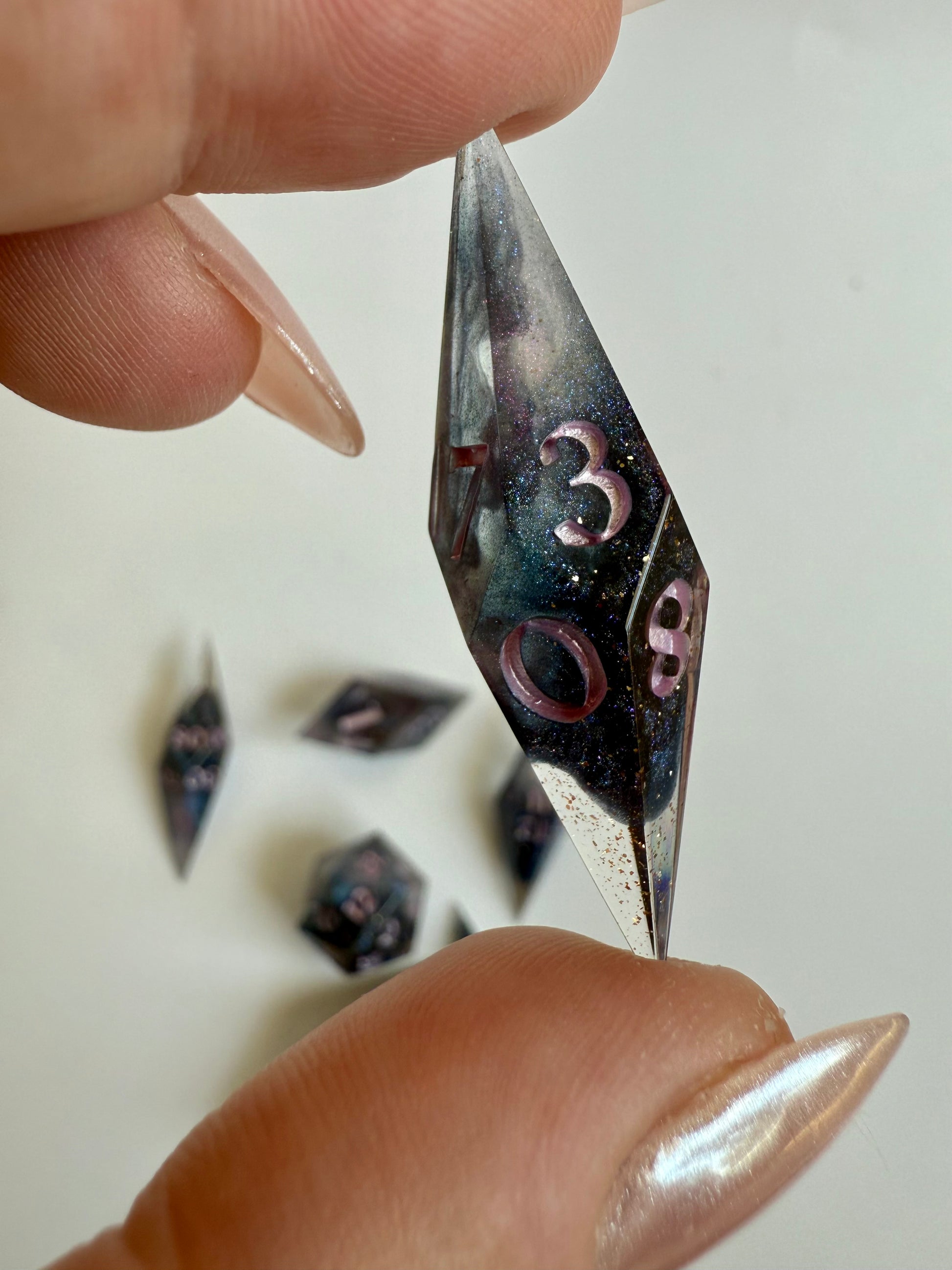 Set of 7 sharp-edge shard dice. Features a clear base with rose gold sparkles, and clouds of color-shifting blue, black and pink. Inked in pale metallic pink.