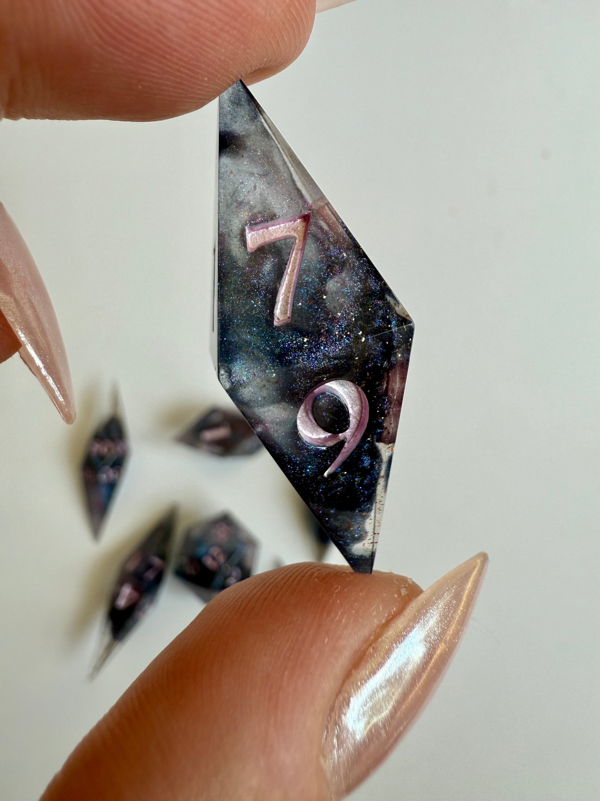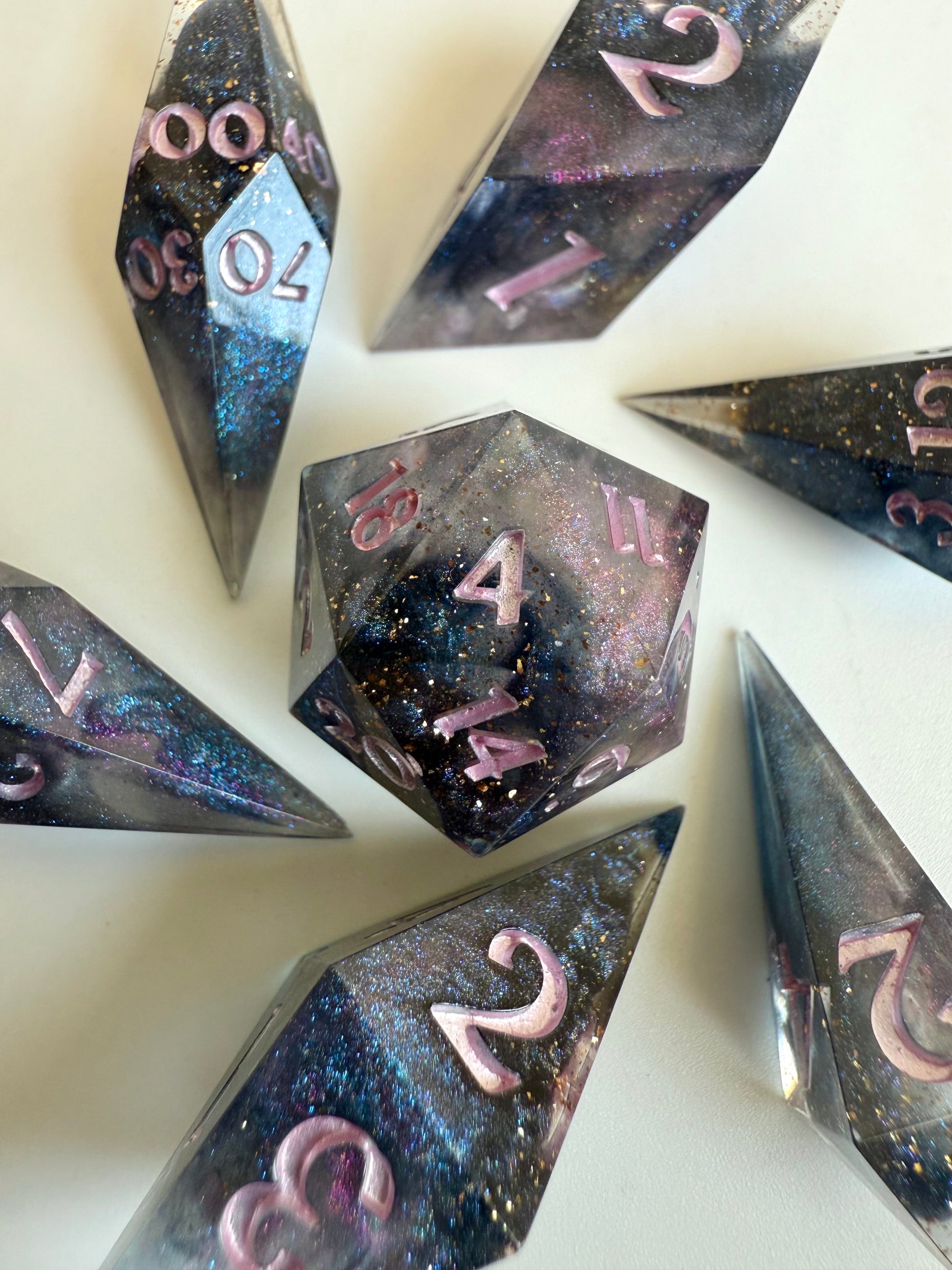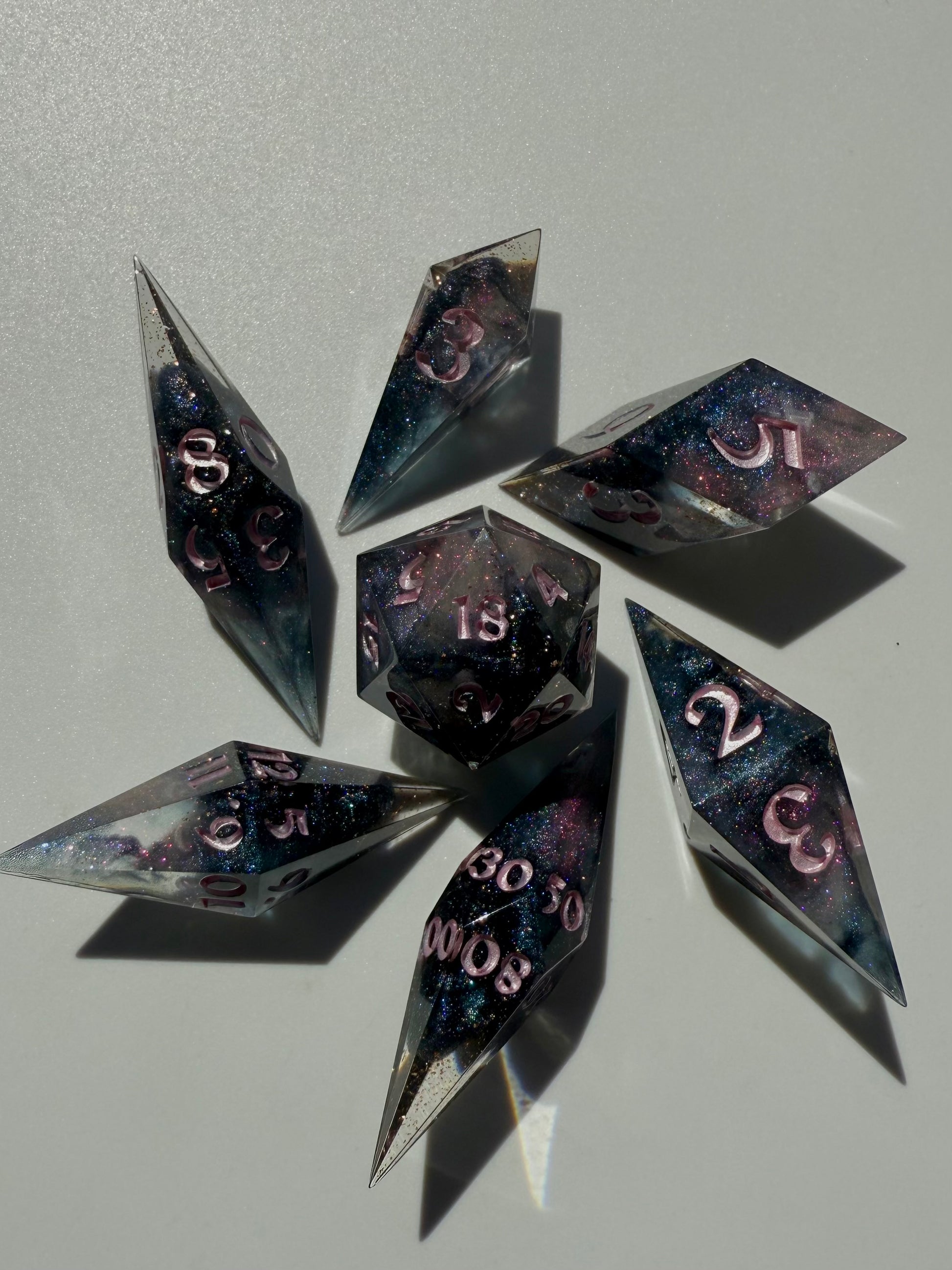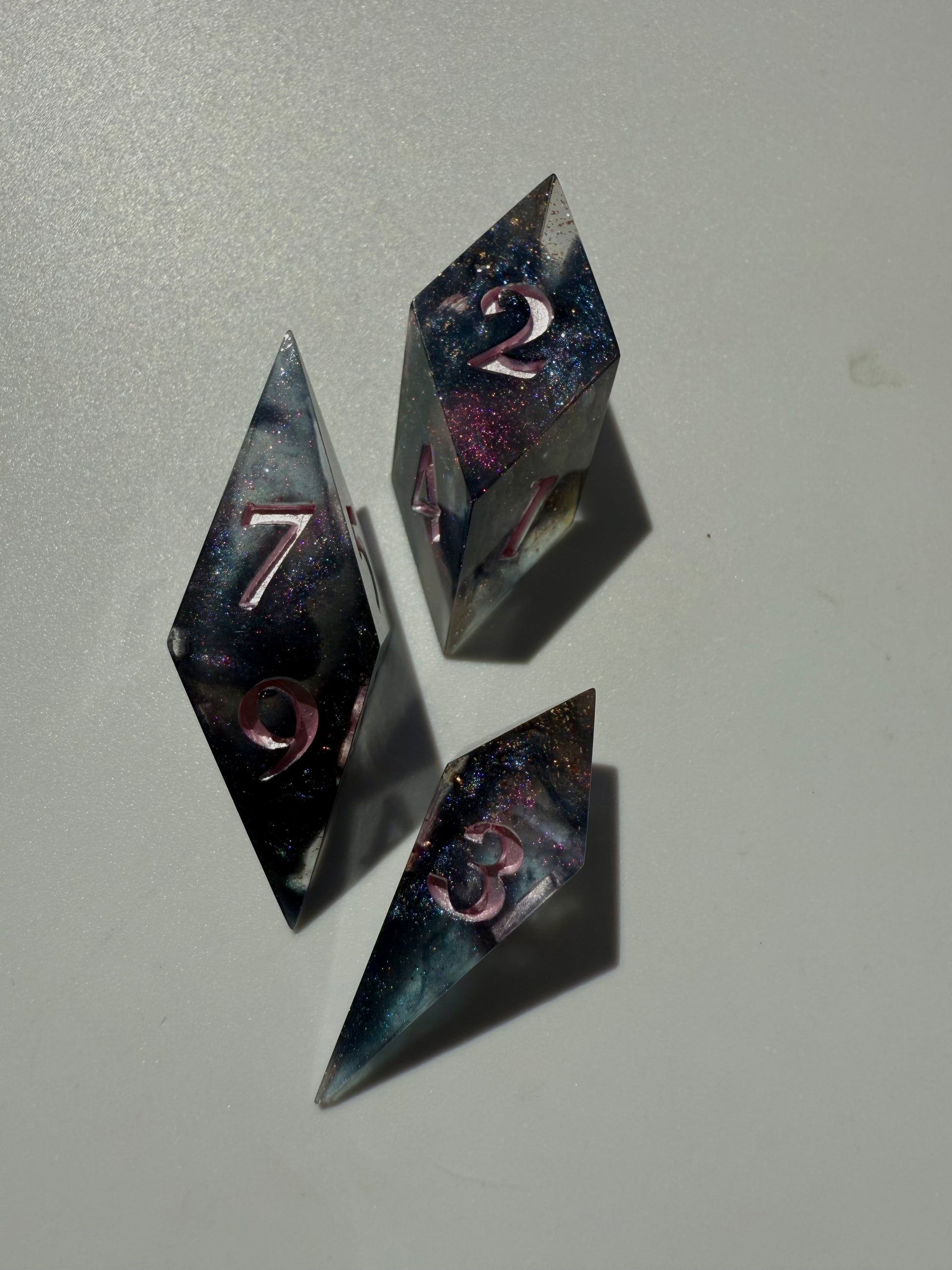 Set of 7 sharp-edge shard dice. Features a clear base with rose gold sparkles, and clouds of color-shifting blue, black and pink. Inked in pale metallic pink.
