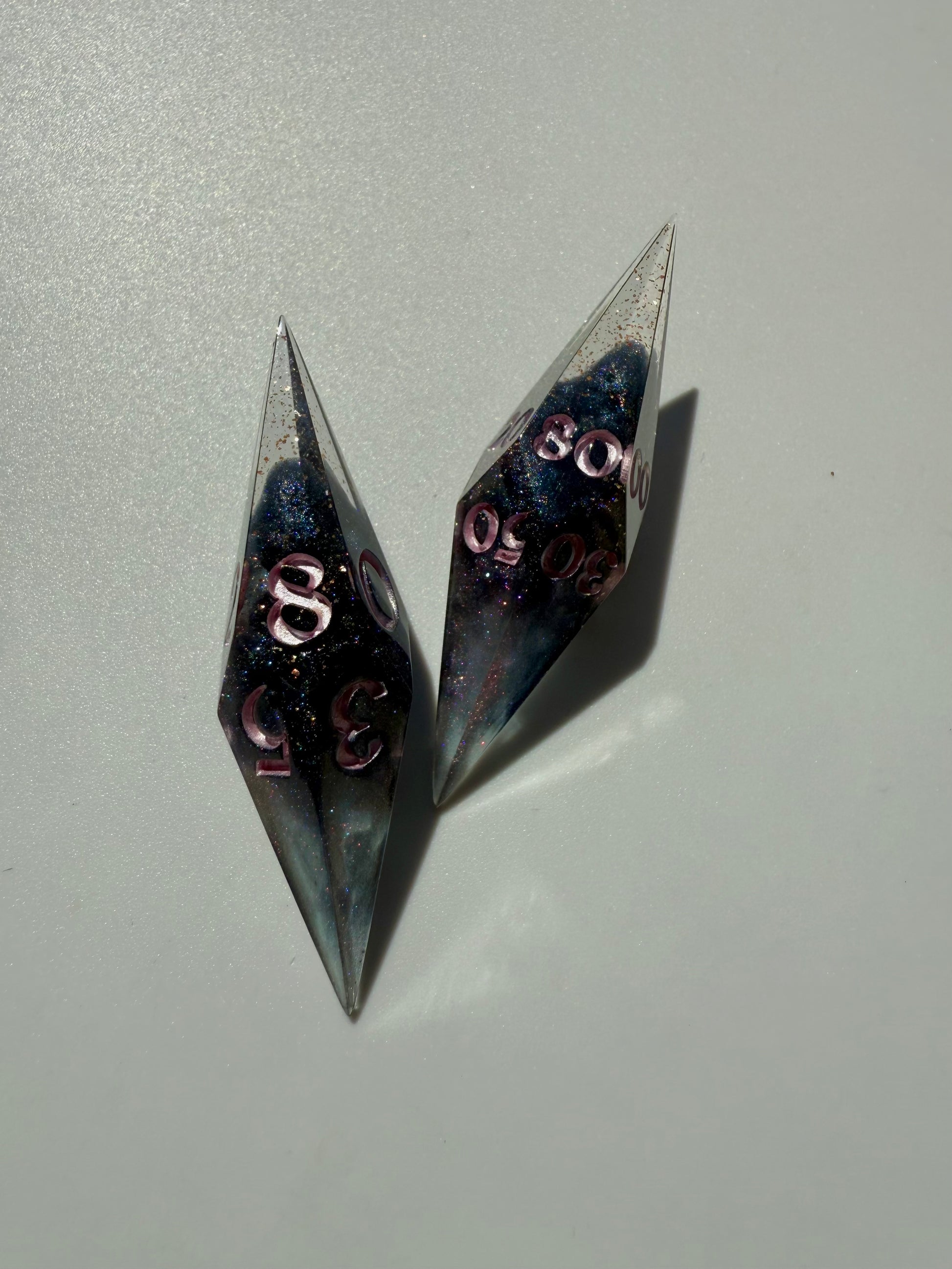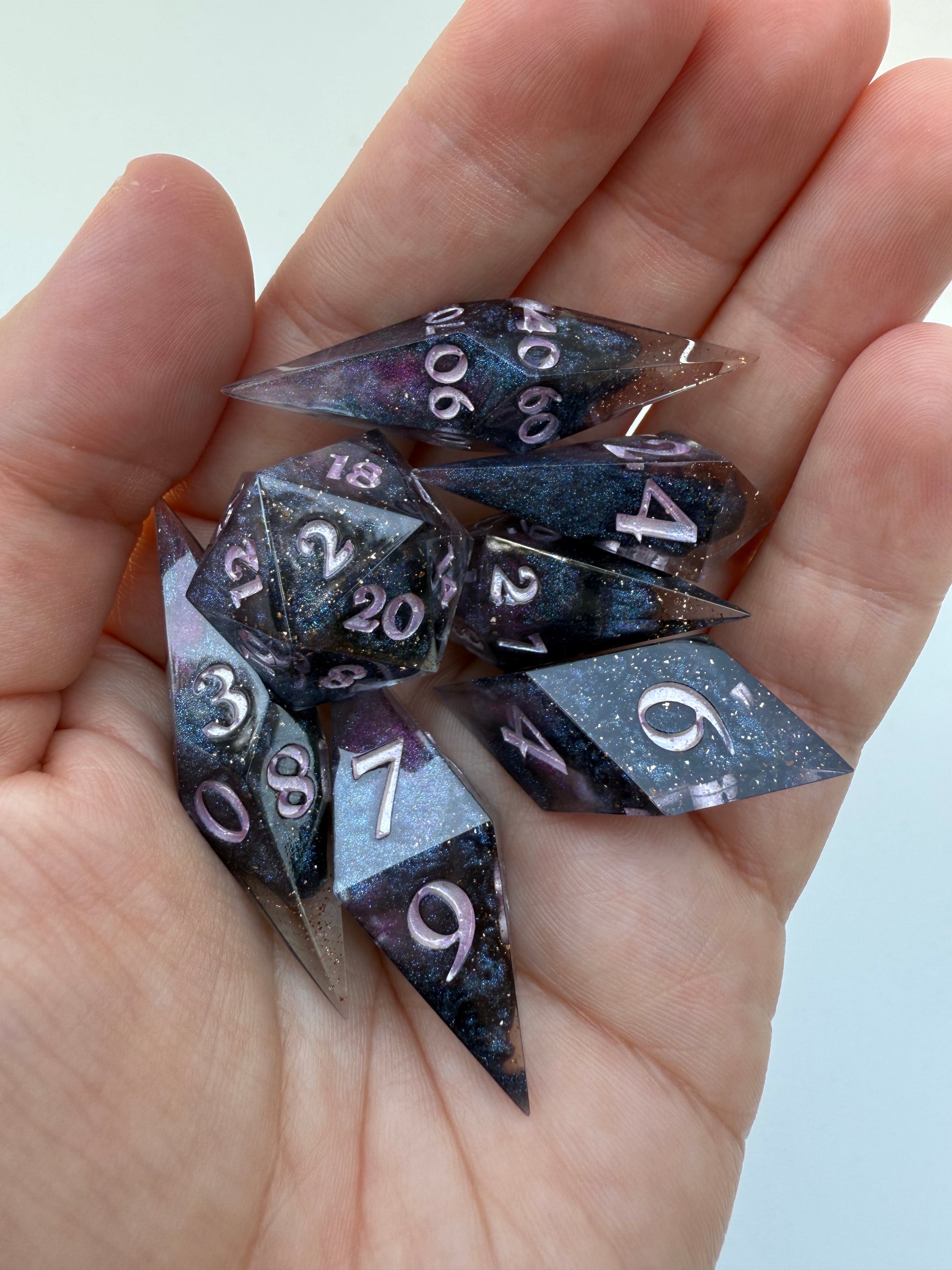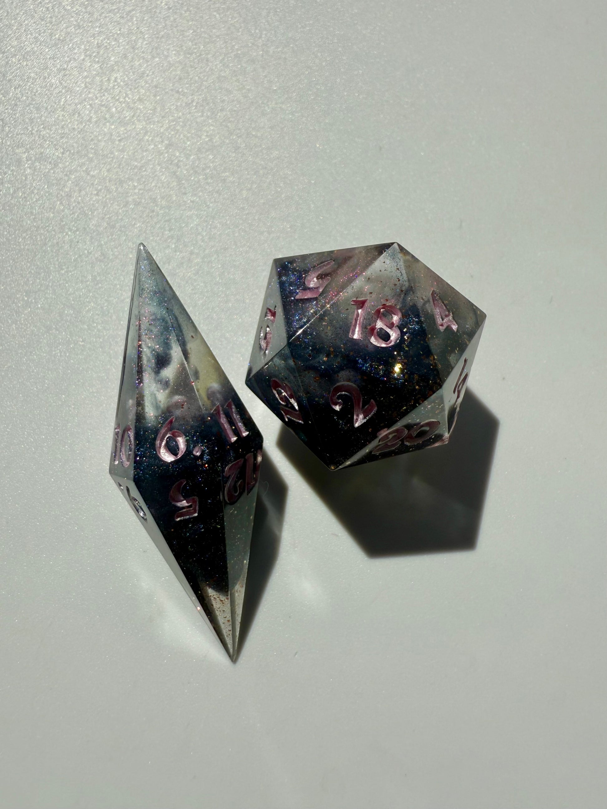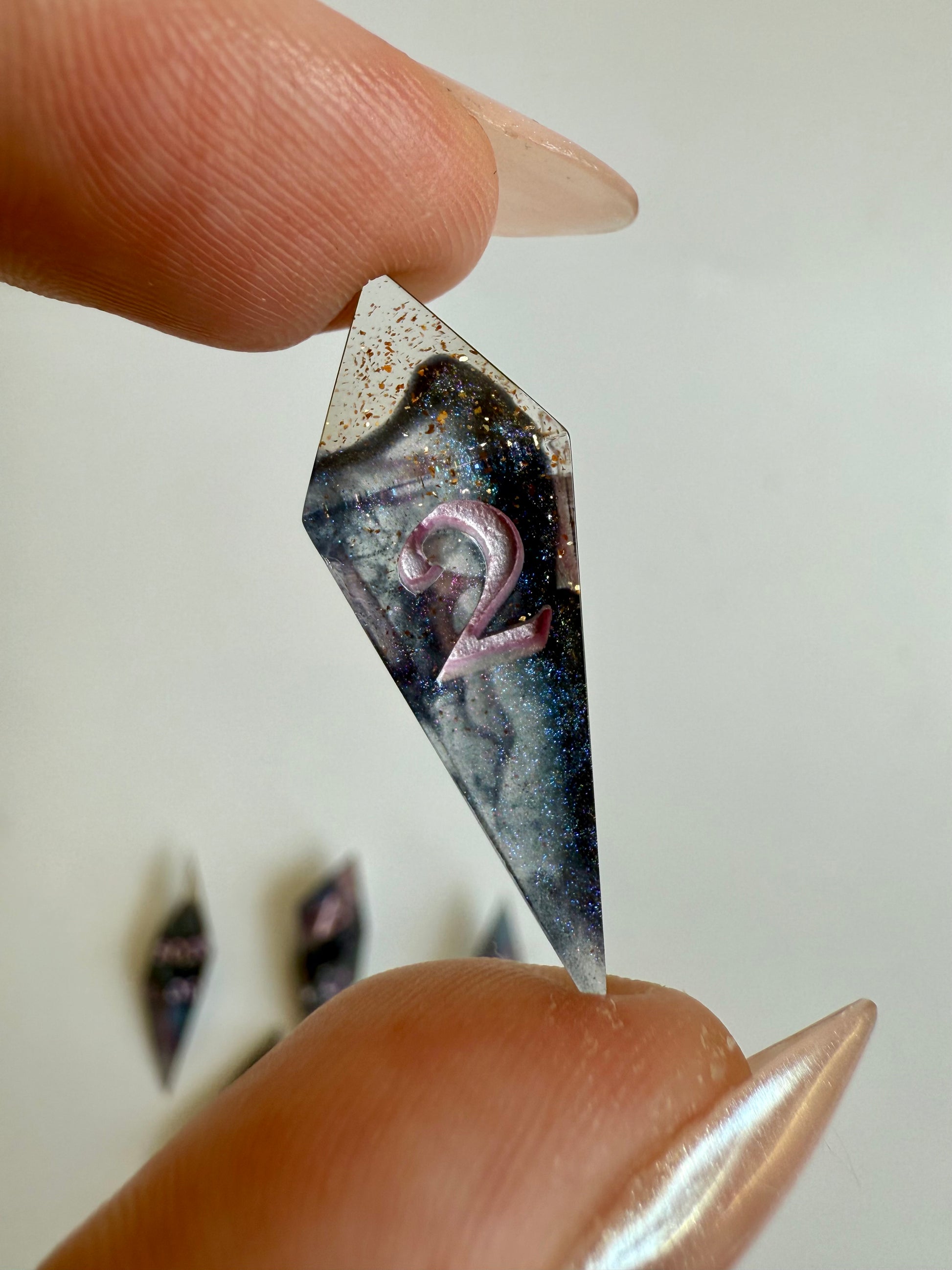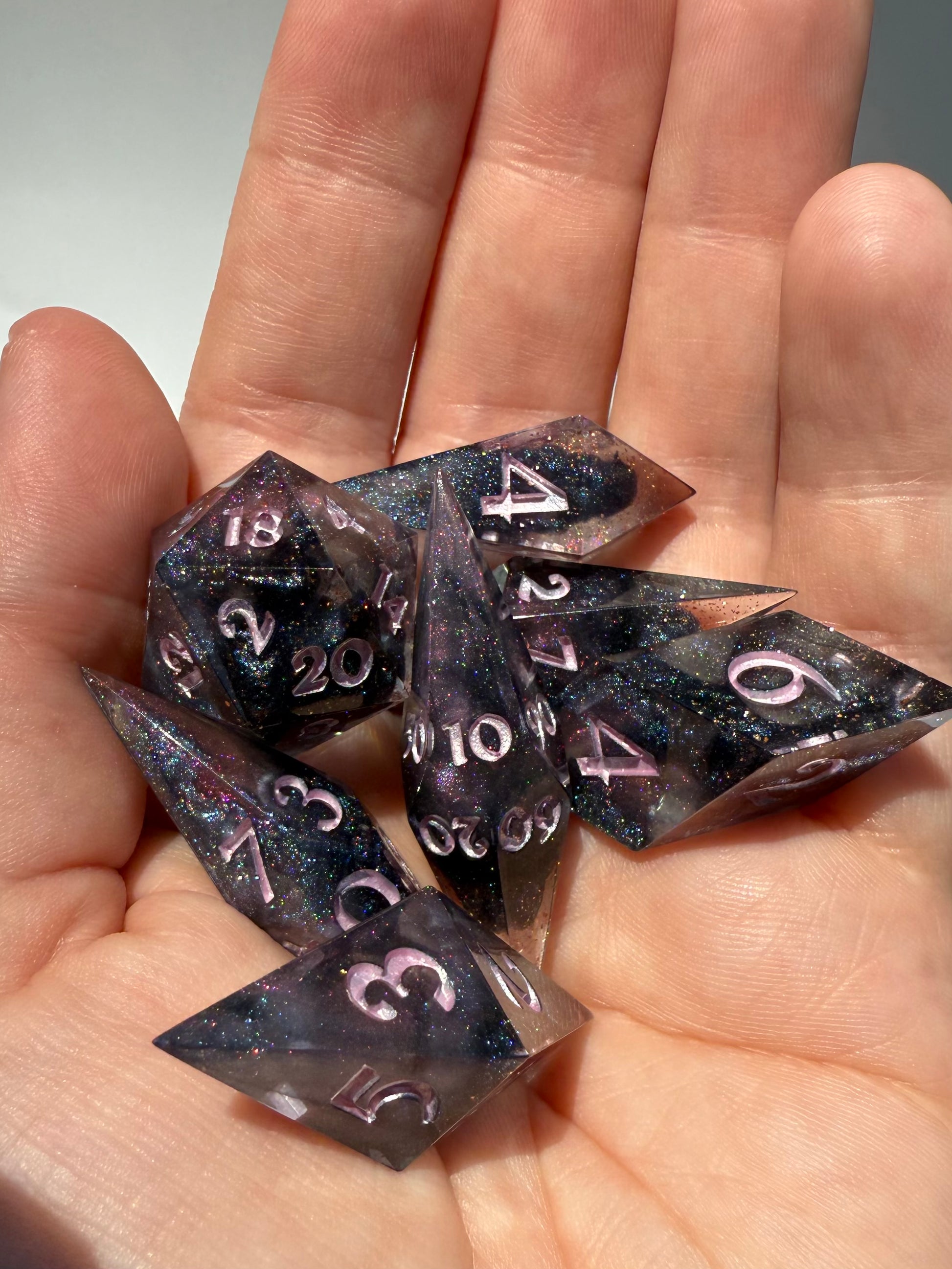 Set of 7 sharp-edge shard dice. Features a clear base with rose gold sparkles, and clouds of color-shifting blue, black and pink. Inked in pale metallic pink.