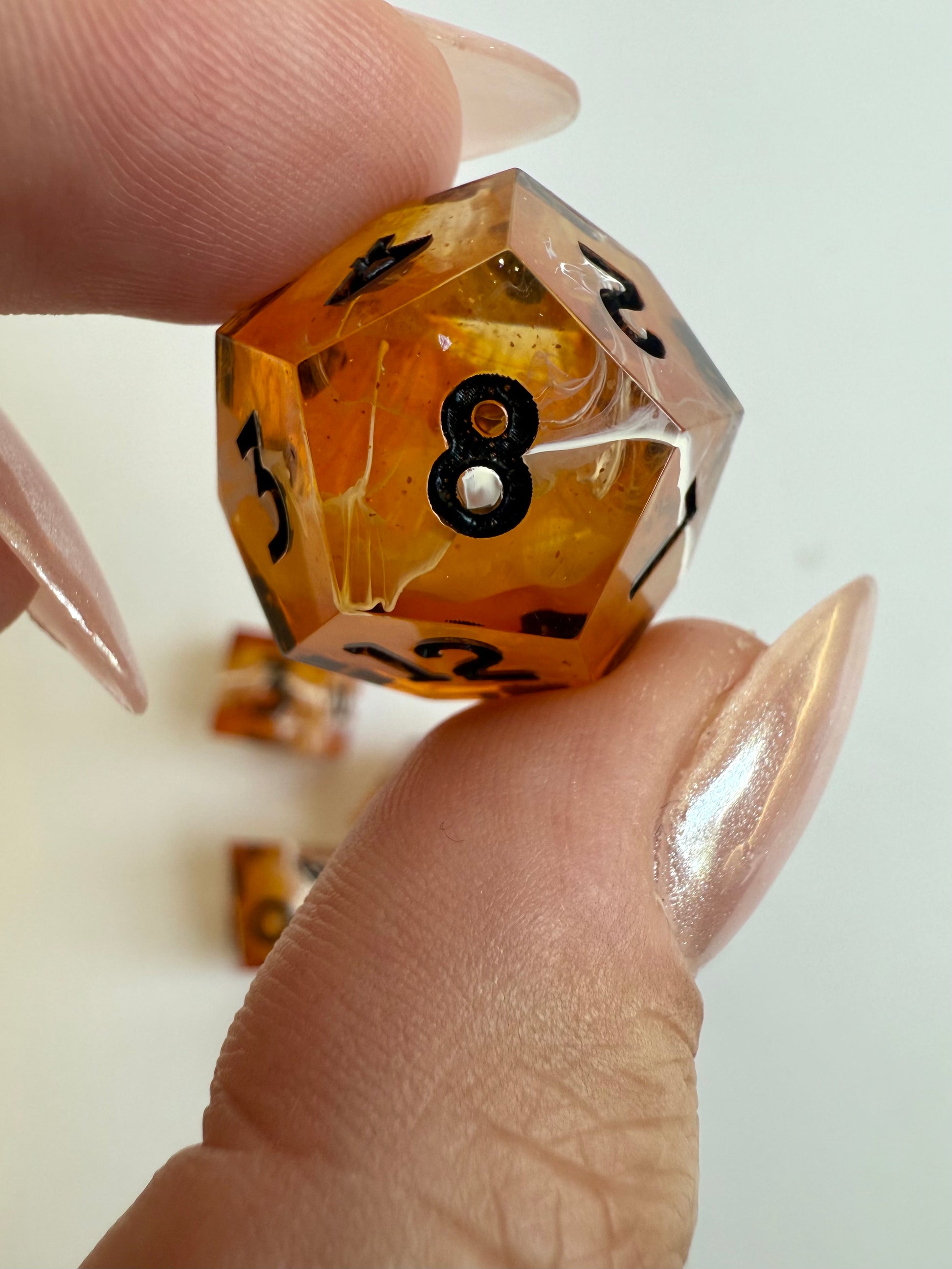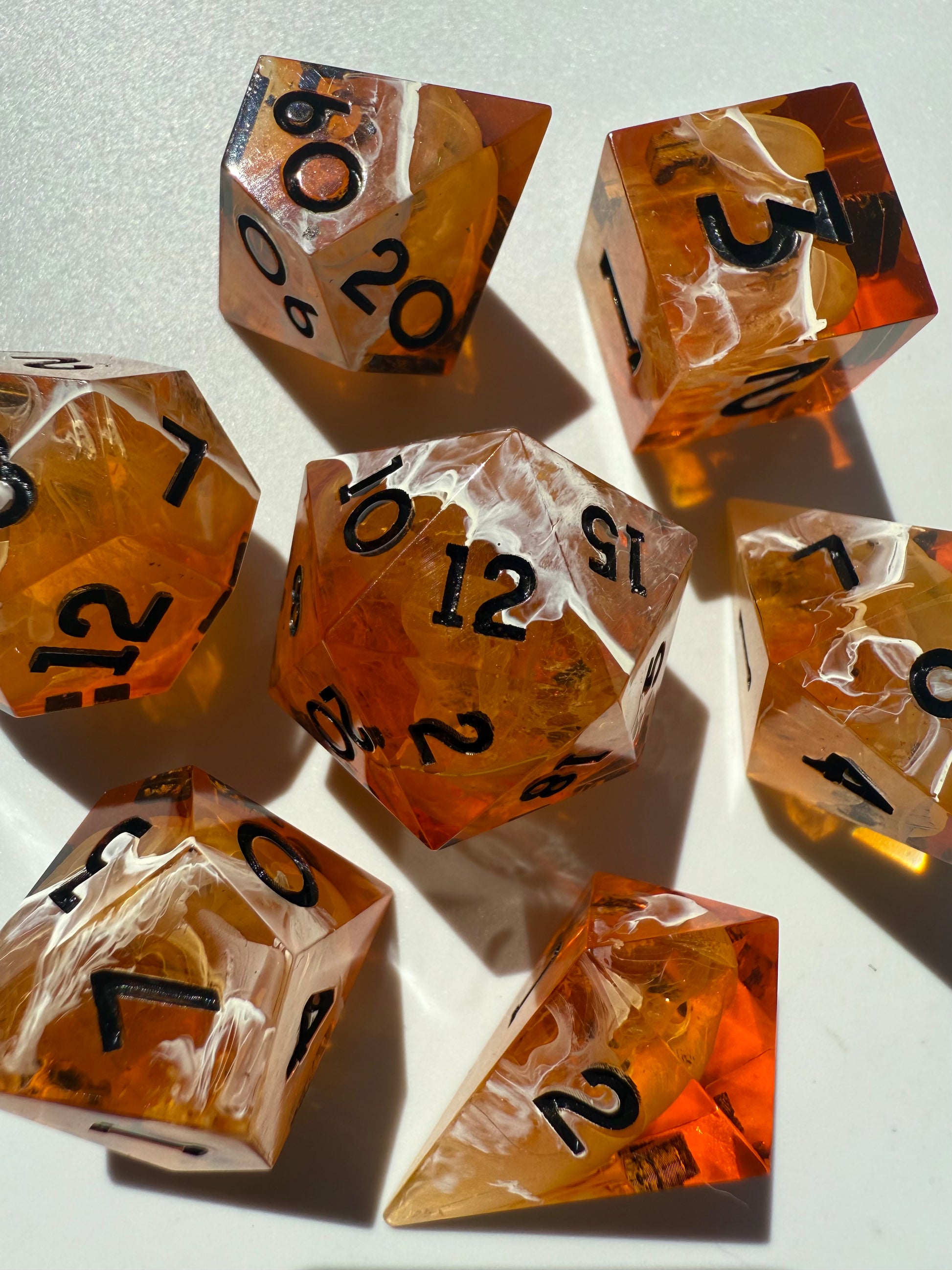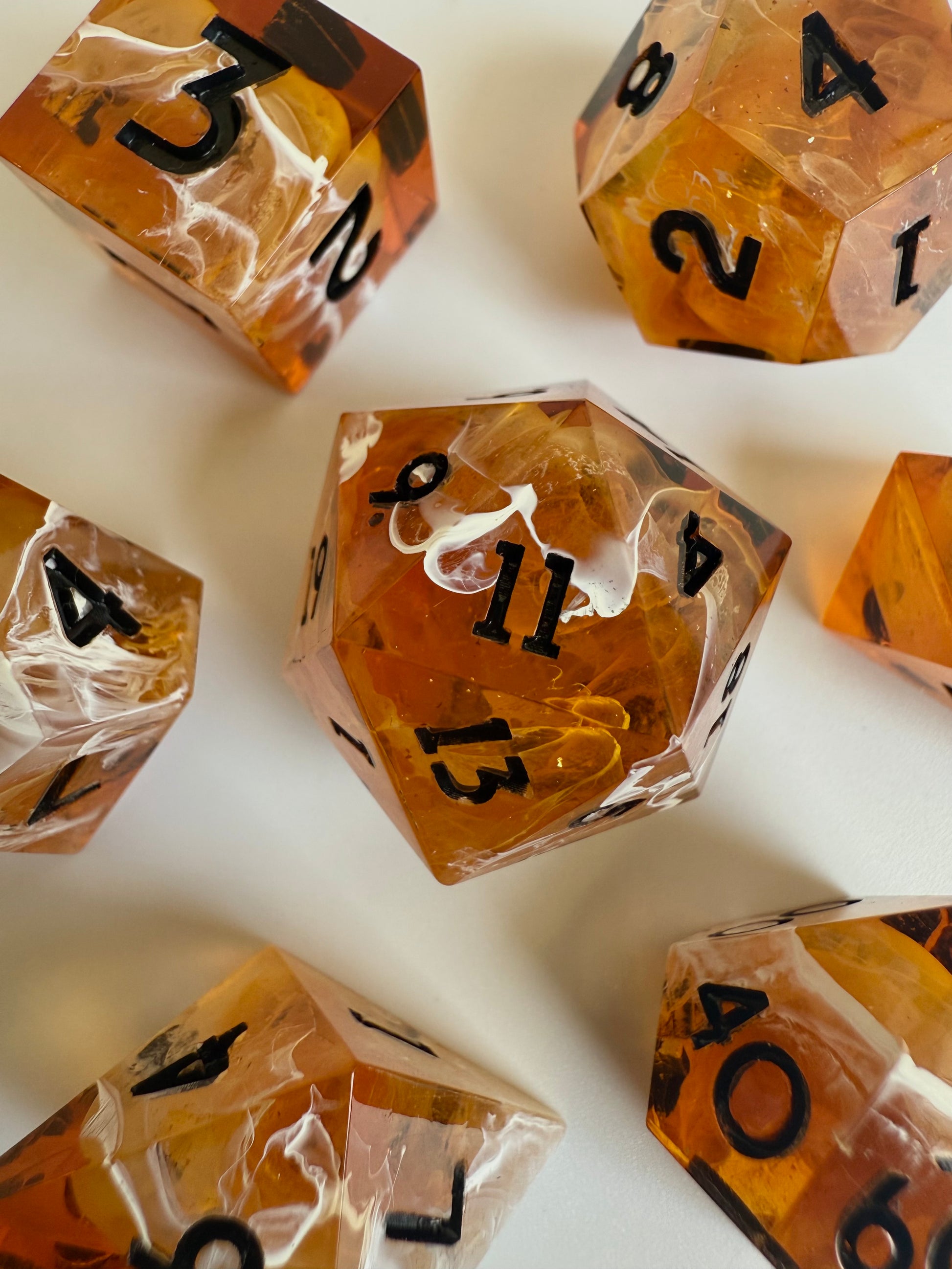 Set of 7 sharp-edge standard dice. Features a translucent amber base with swirls of rose gold glitter and white ink waves. Inked in black.