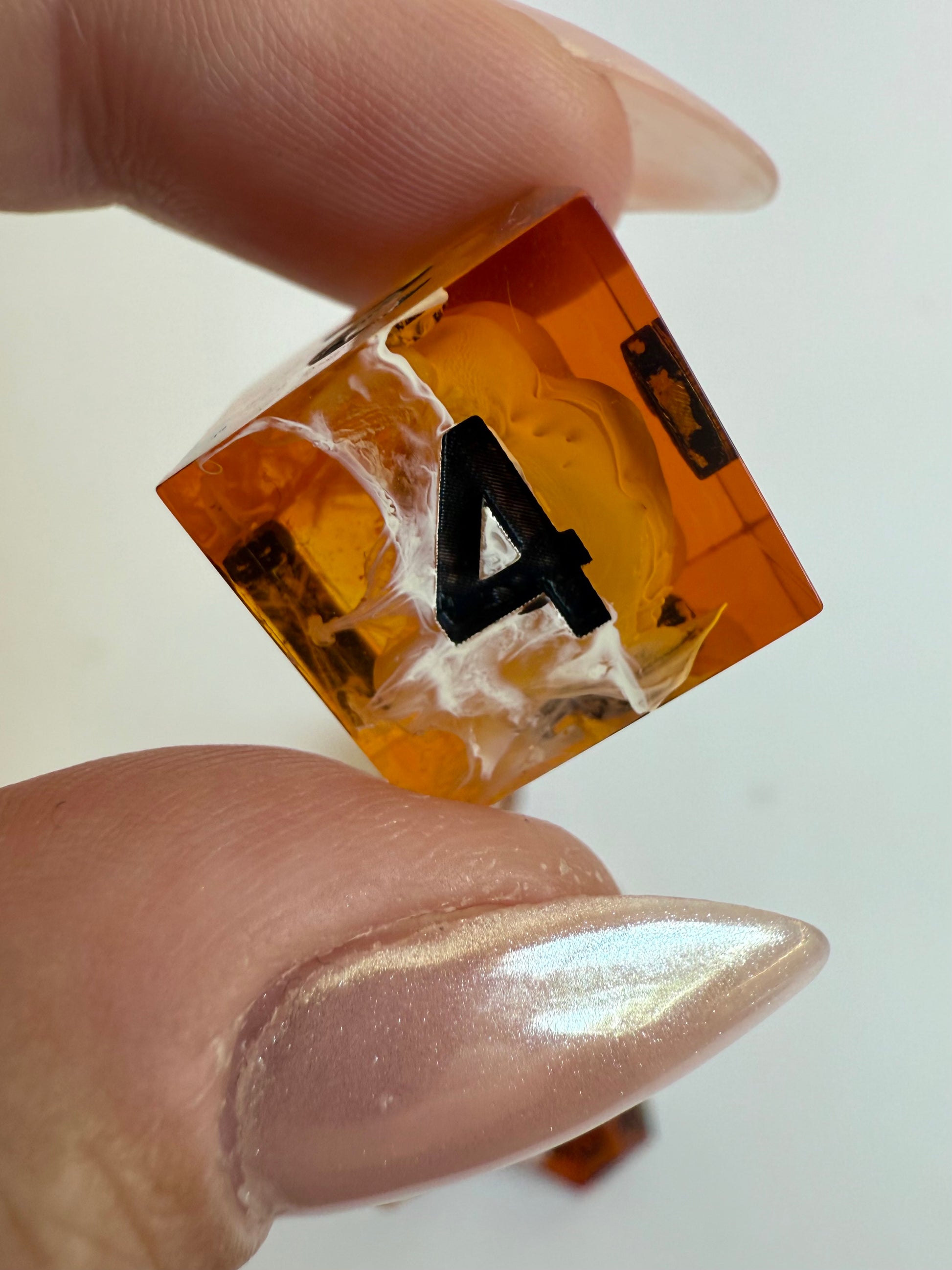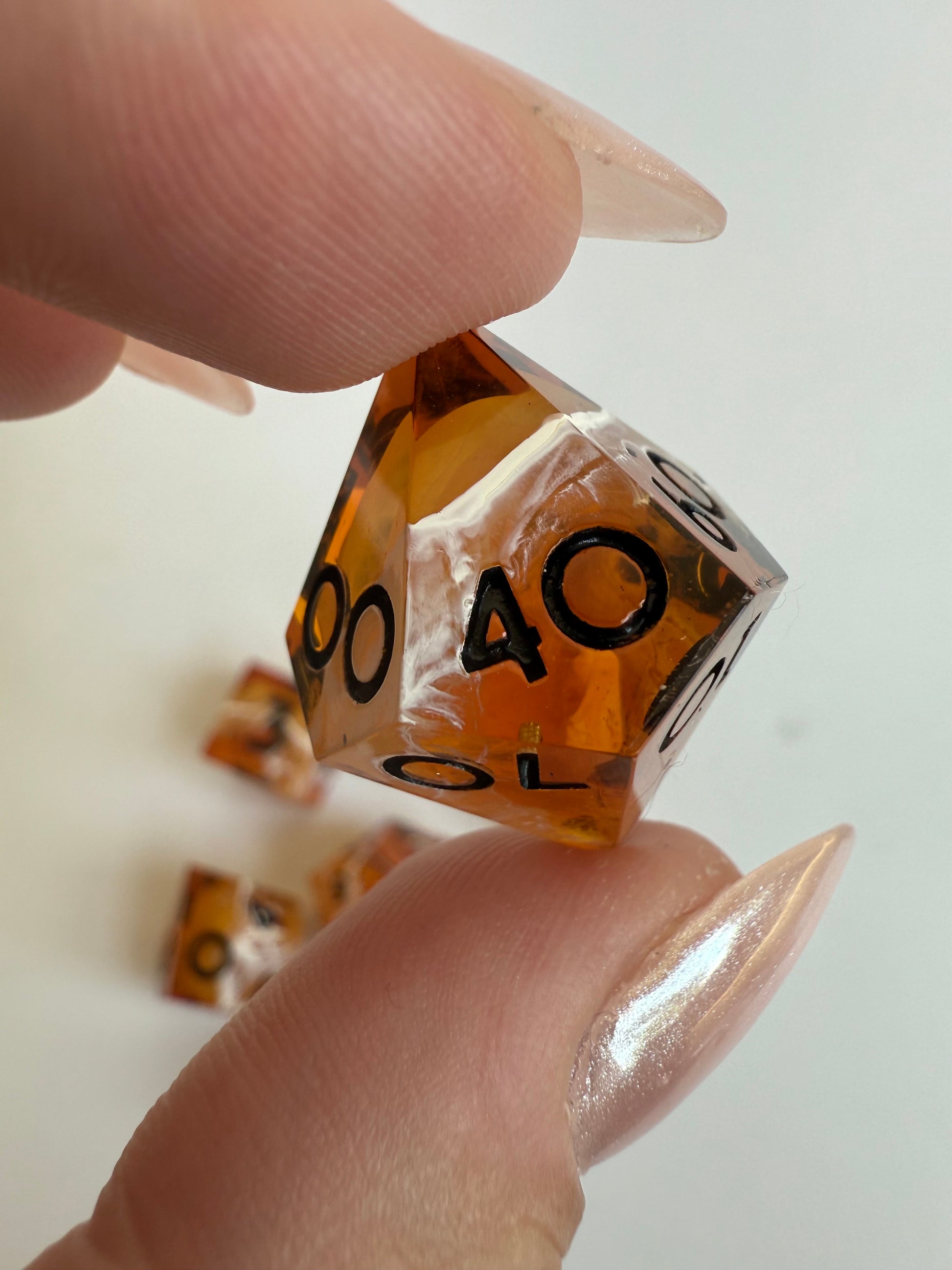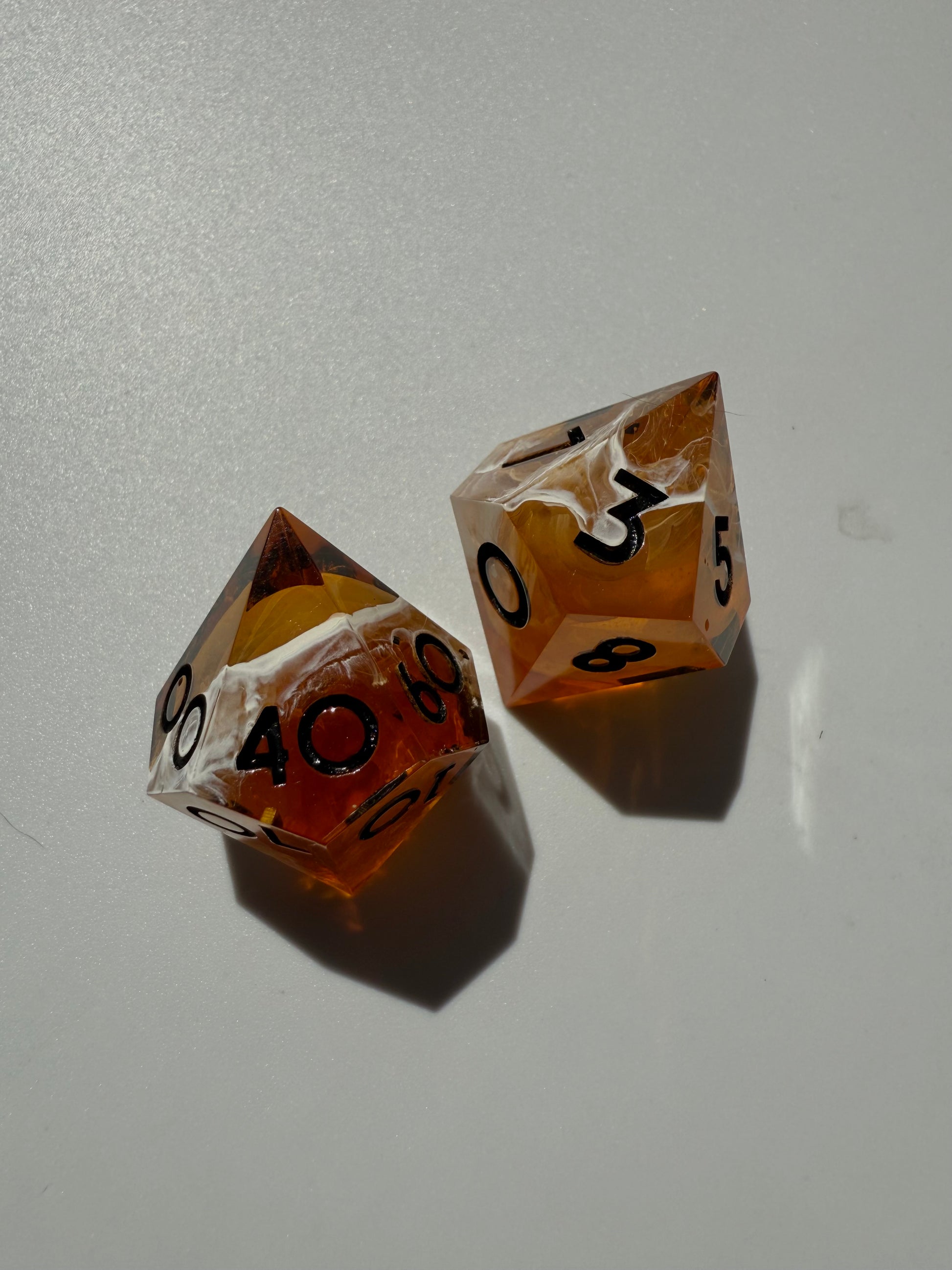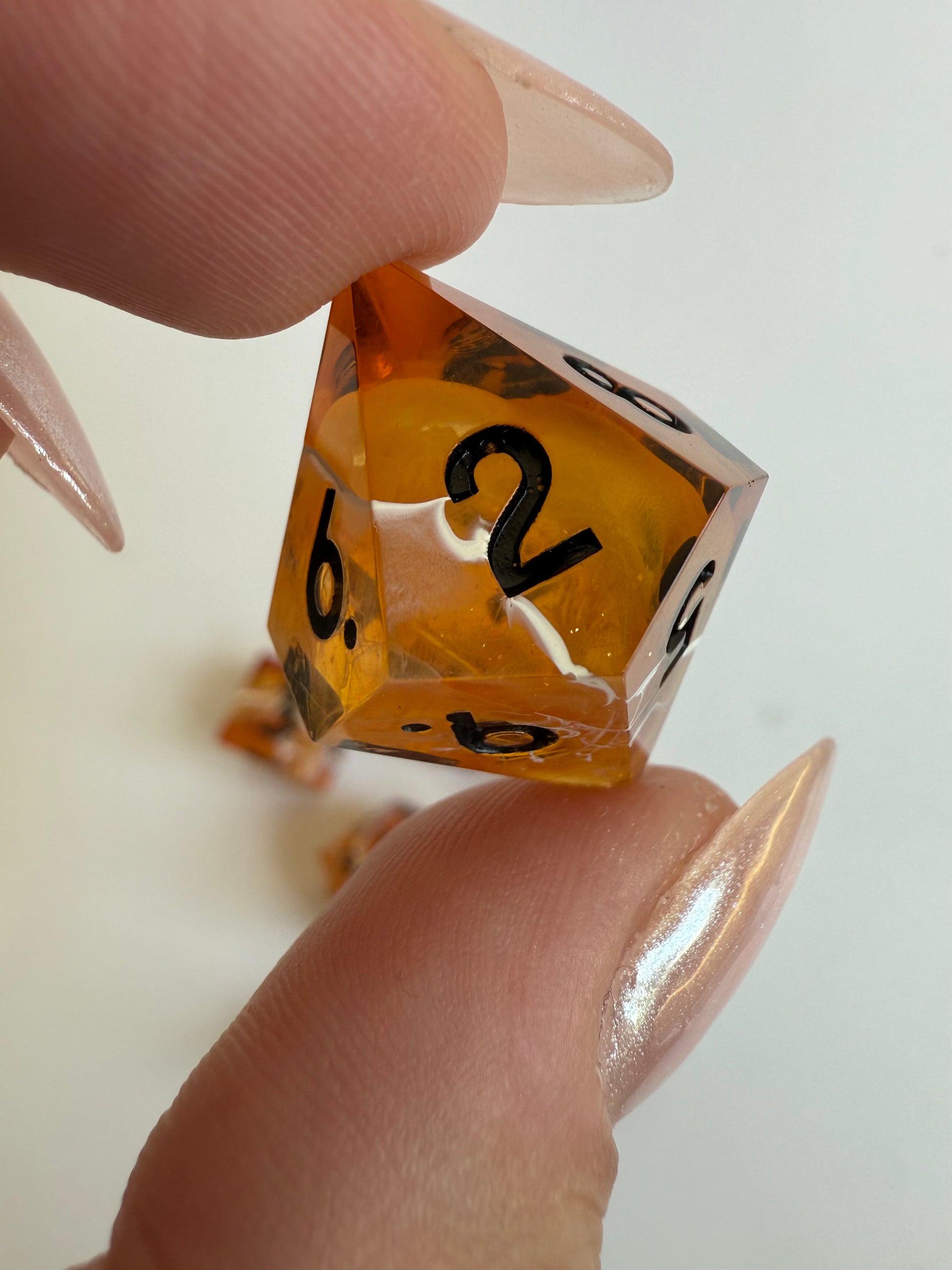 Set of 7 sharp-edge standard dice. Features a translucent amber base with swirls of rose gold glitter and white ink waves. Inked in black.