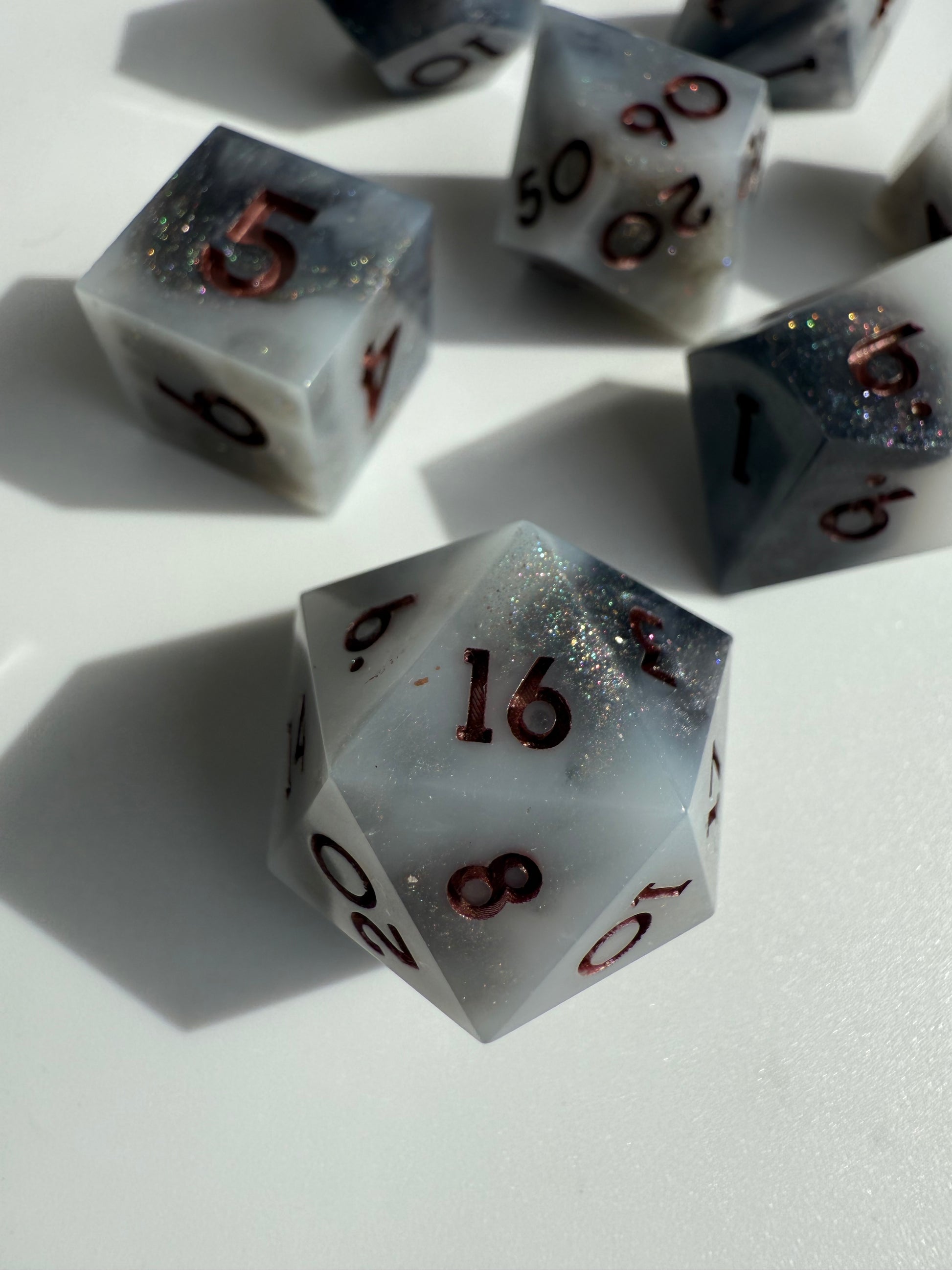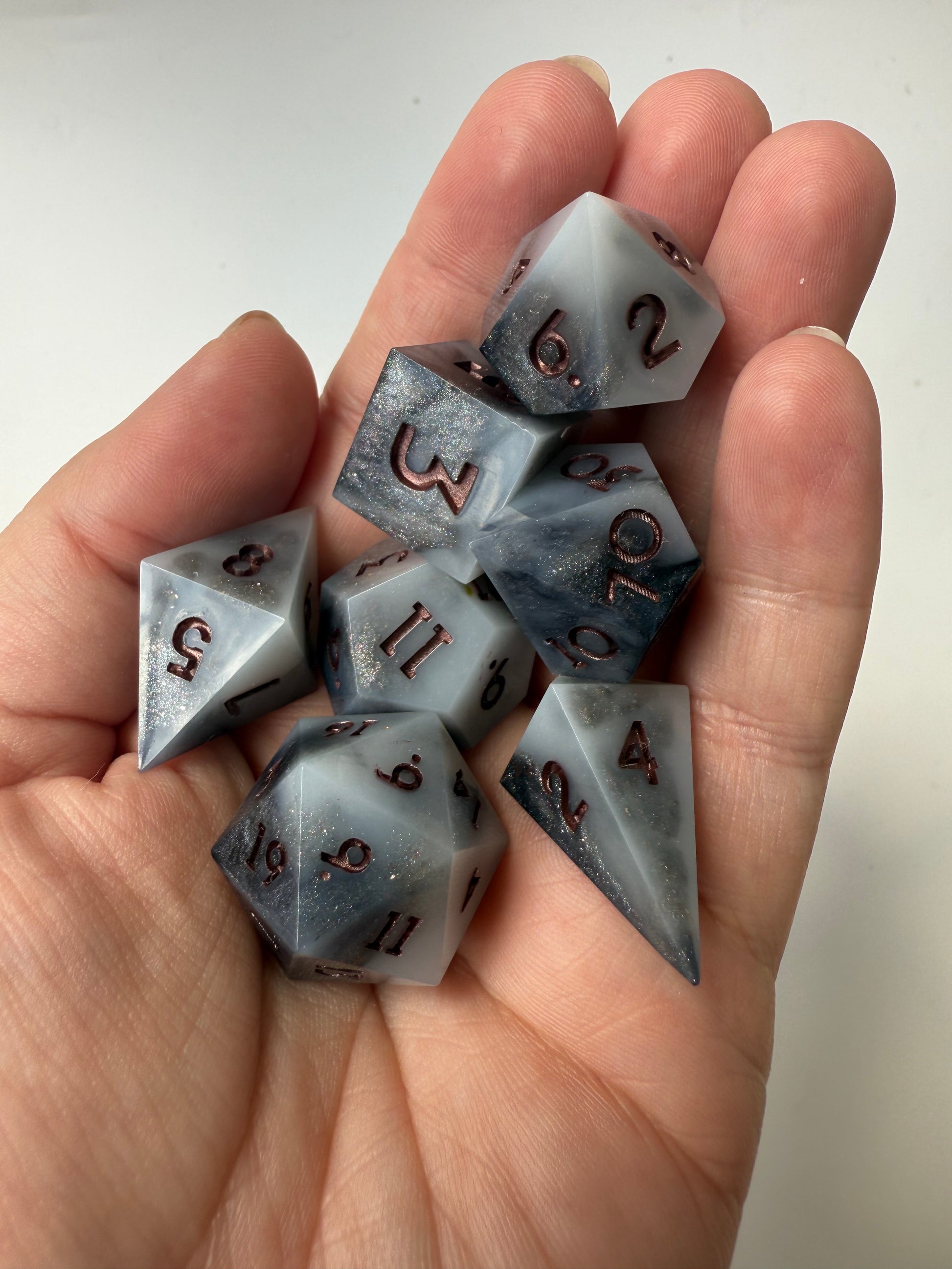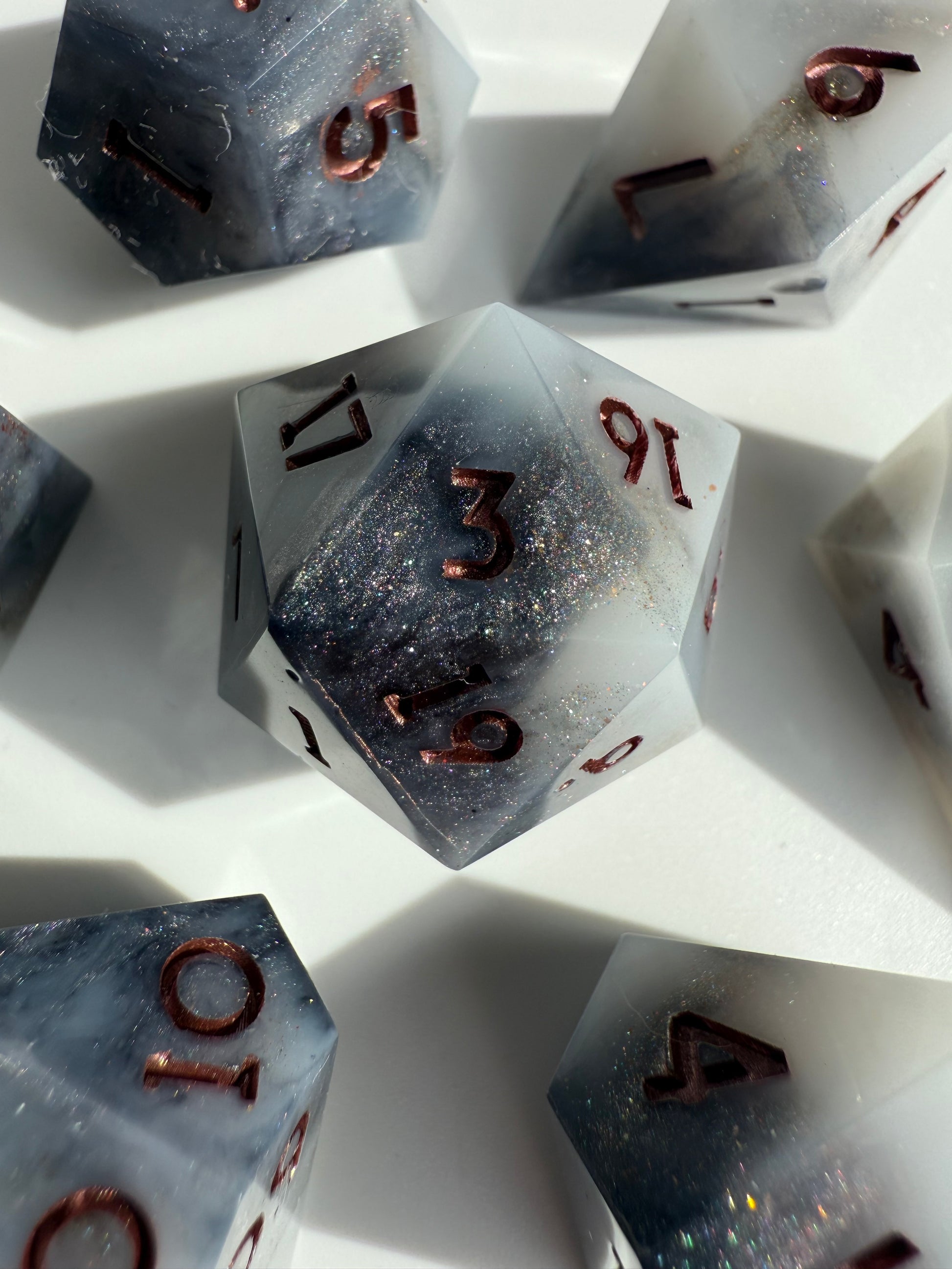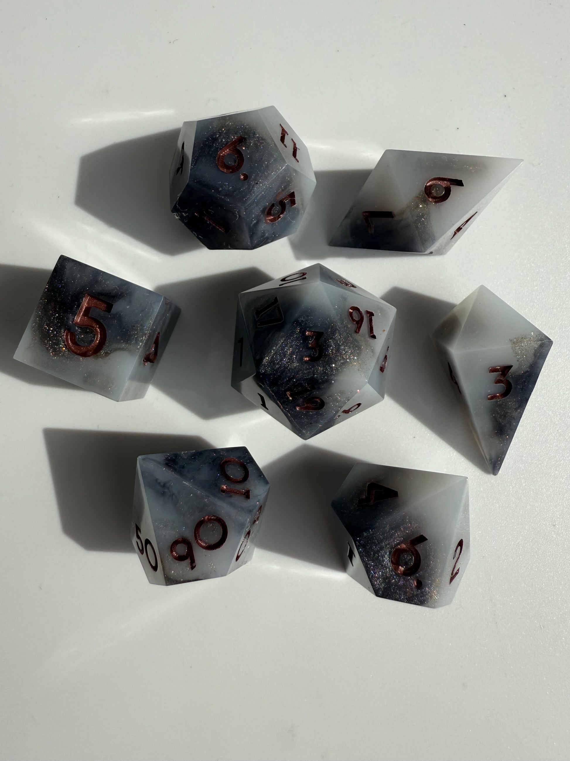 Set of 7 sharp-edge standard dice. Features a black and white base with swirls of silver and holographic shimmer. Inked in dark bronze.