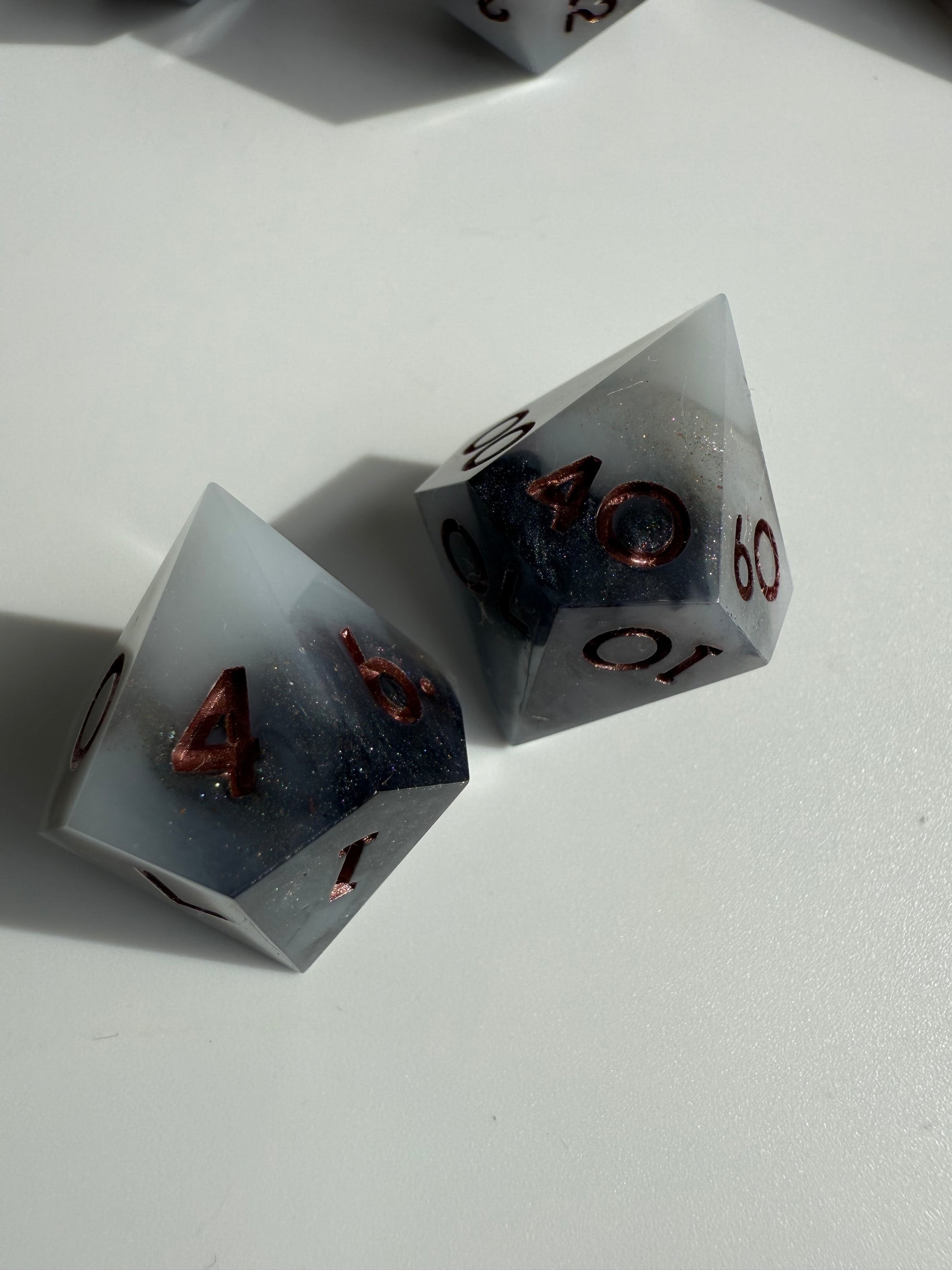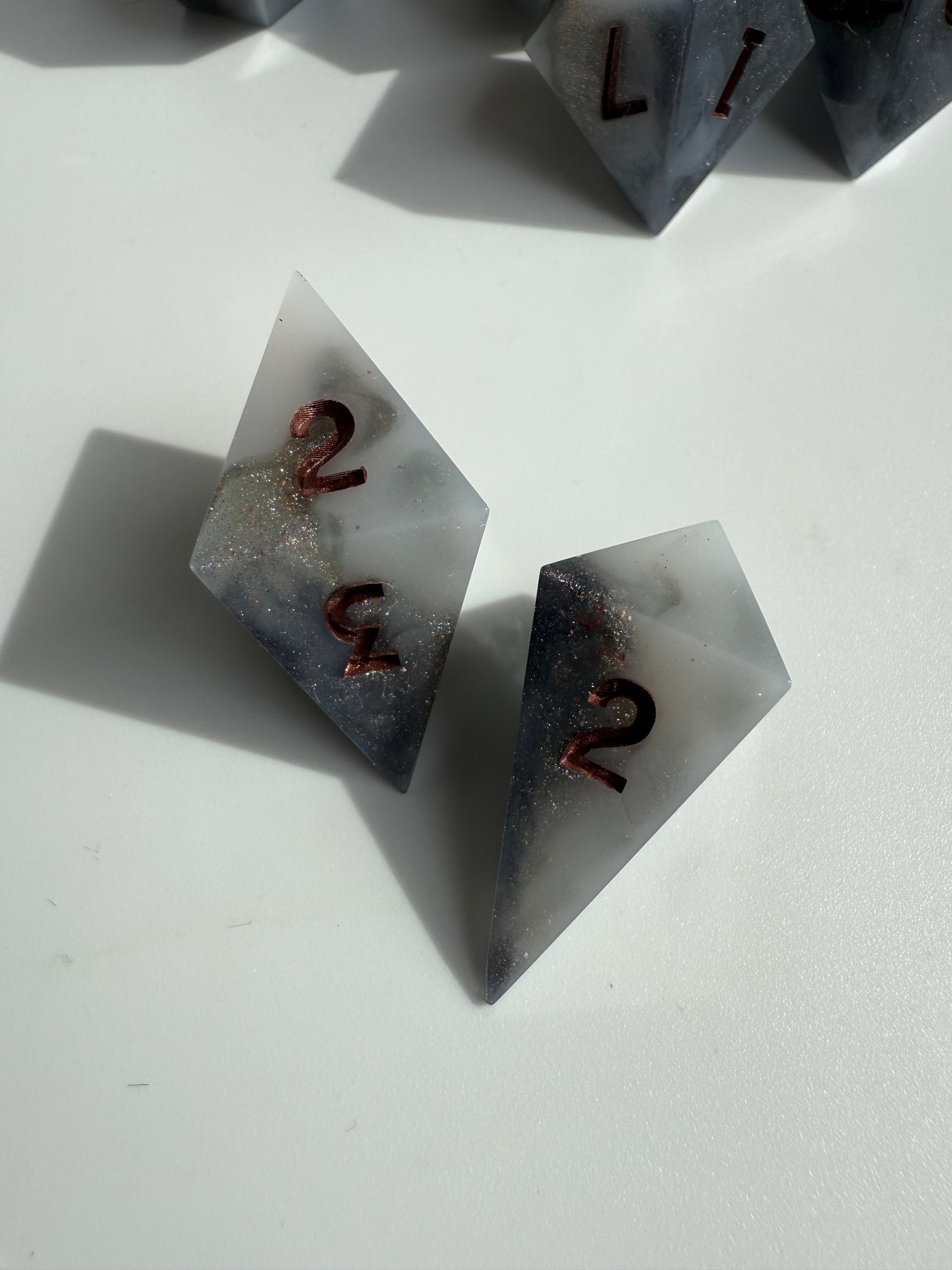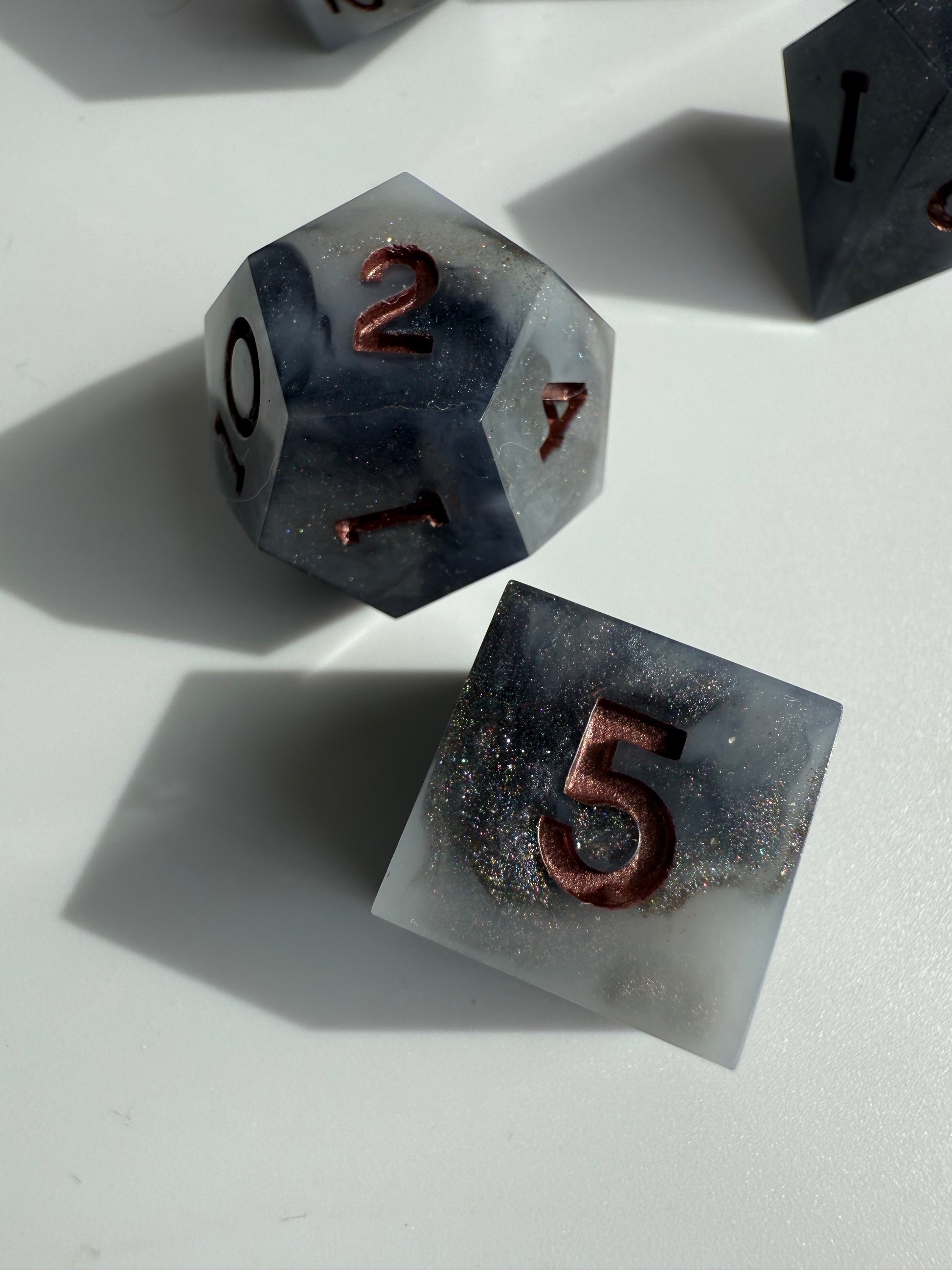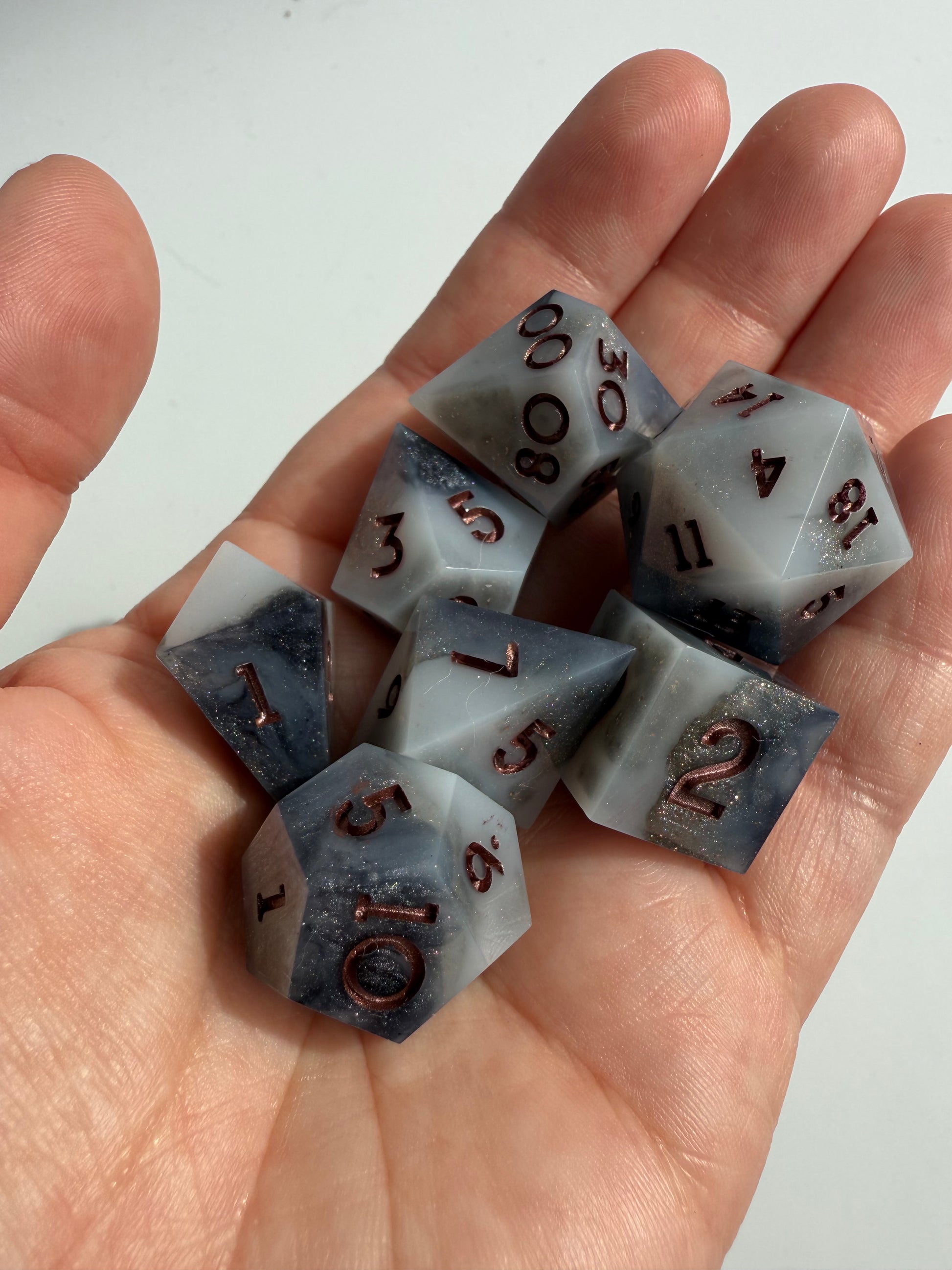 Set of 7 sharp-edge standard dice. Features a black and white base with swirls of silver and holographic shimmer. Inked in dark bronze.