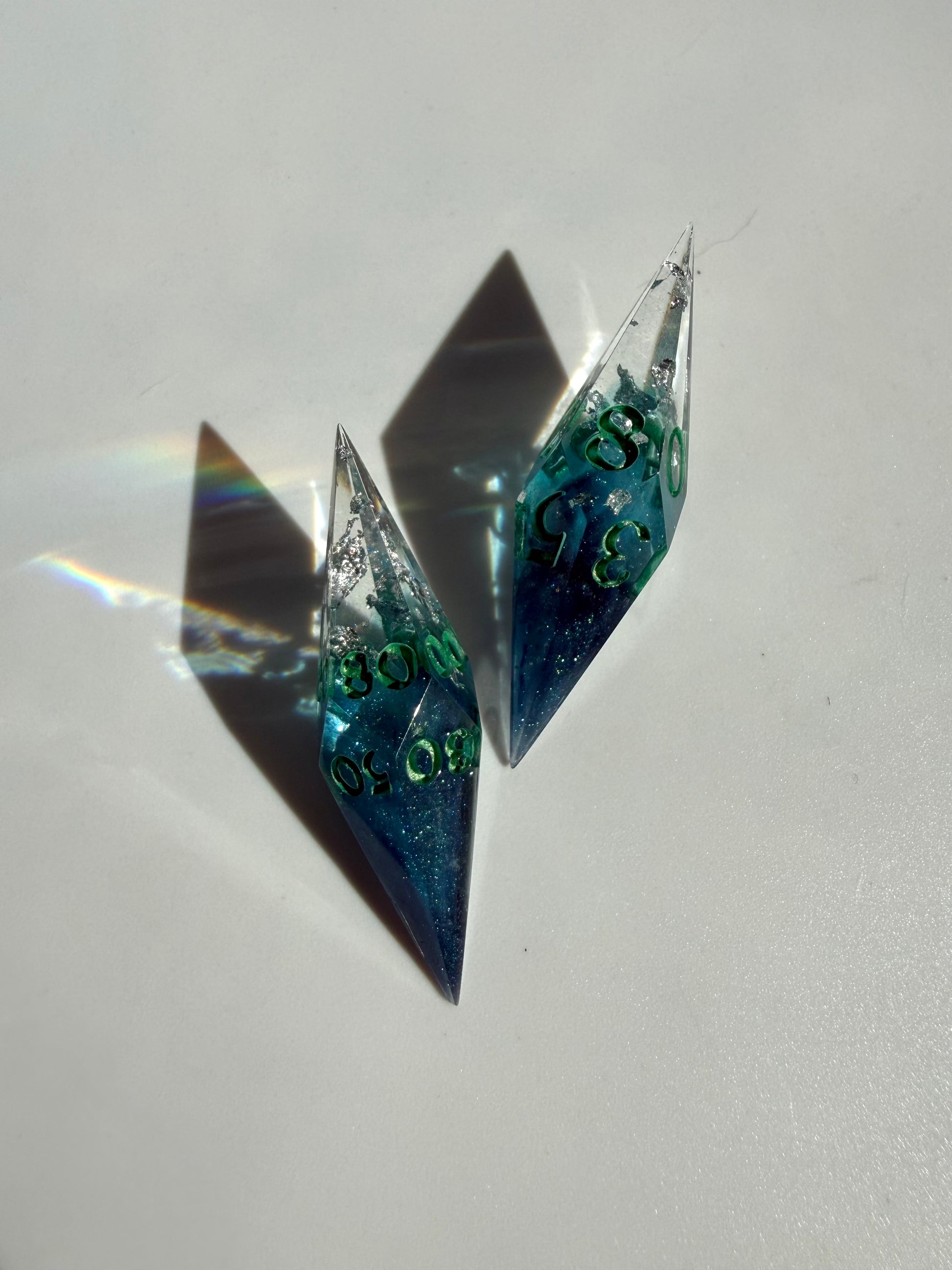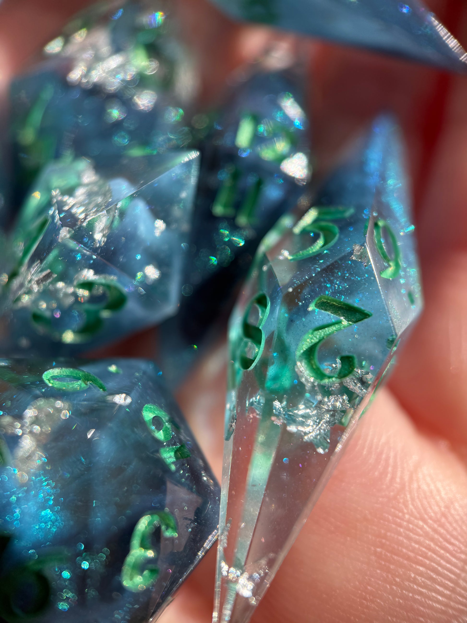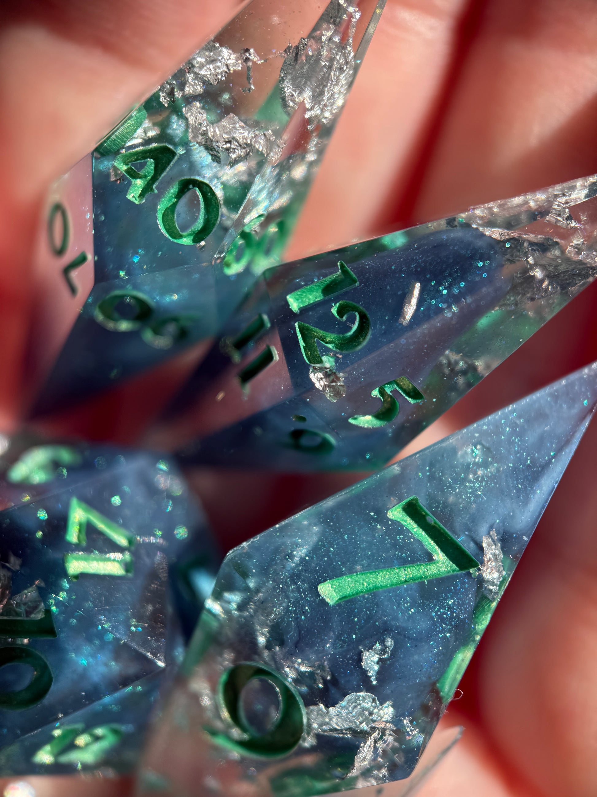 Set of 7 sharp-edge shard dice. Features a clear and translucent blue base with light and dark blue color shifting clouds and silver foil. Inked in metallic green.