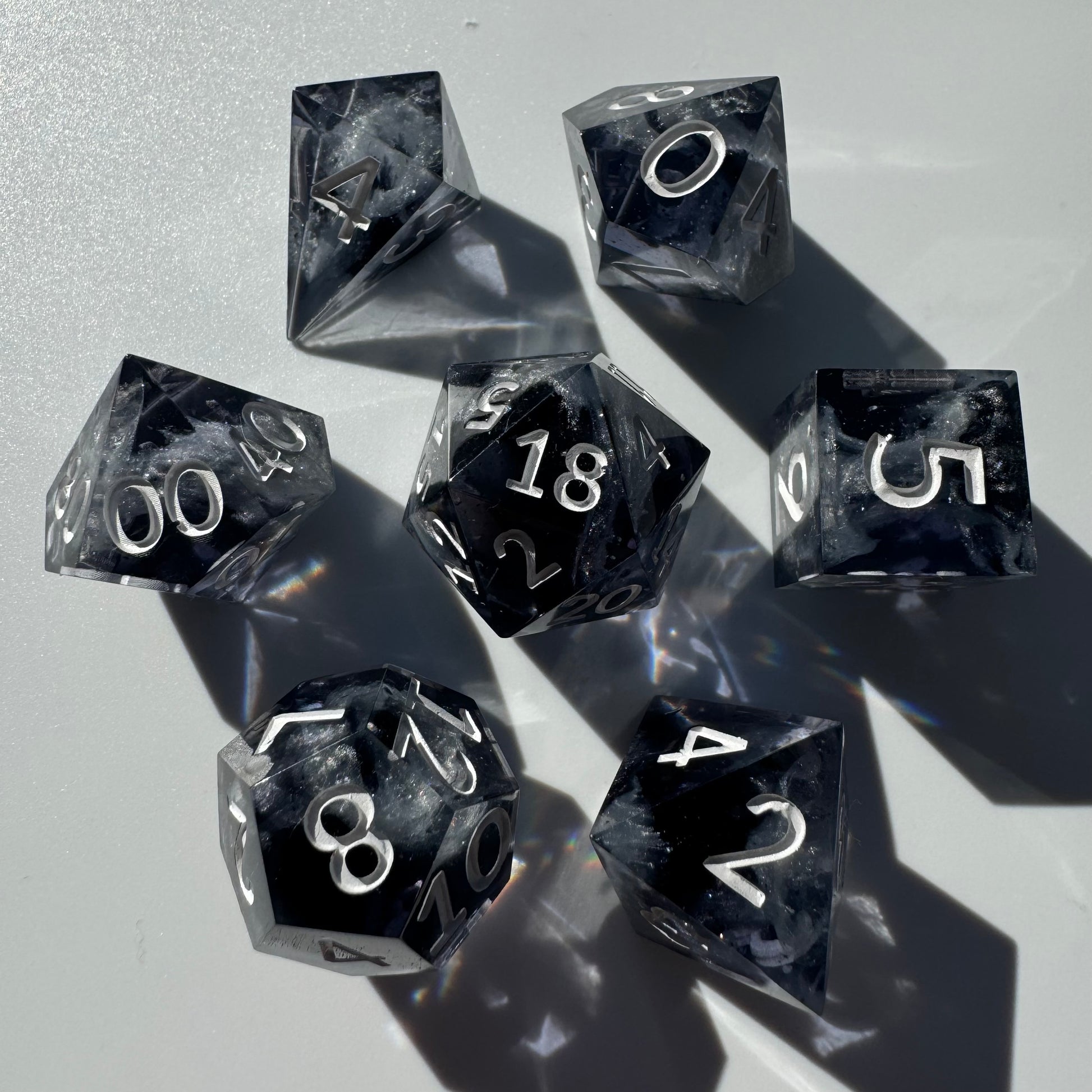 Set of 7 sharp-edge dice. Features a translucent blue-grey base with silver foil and clouds of bright glittery silver. Inked in white.