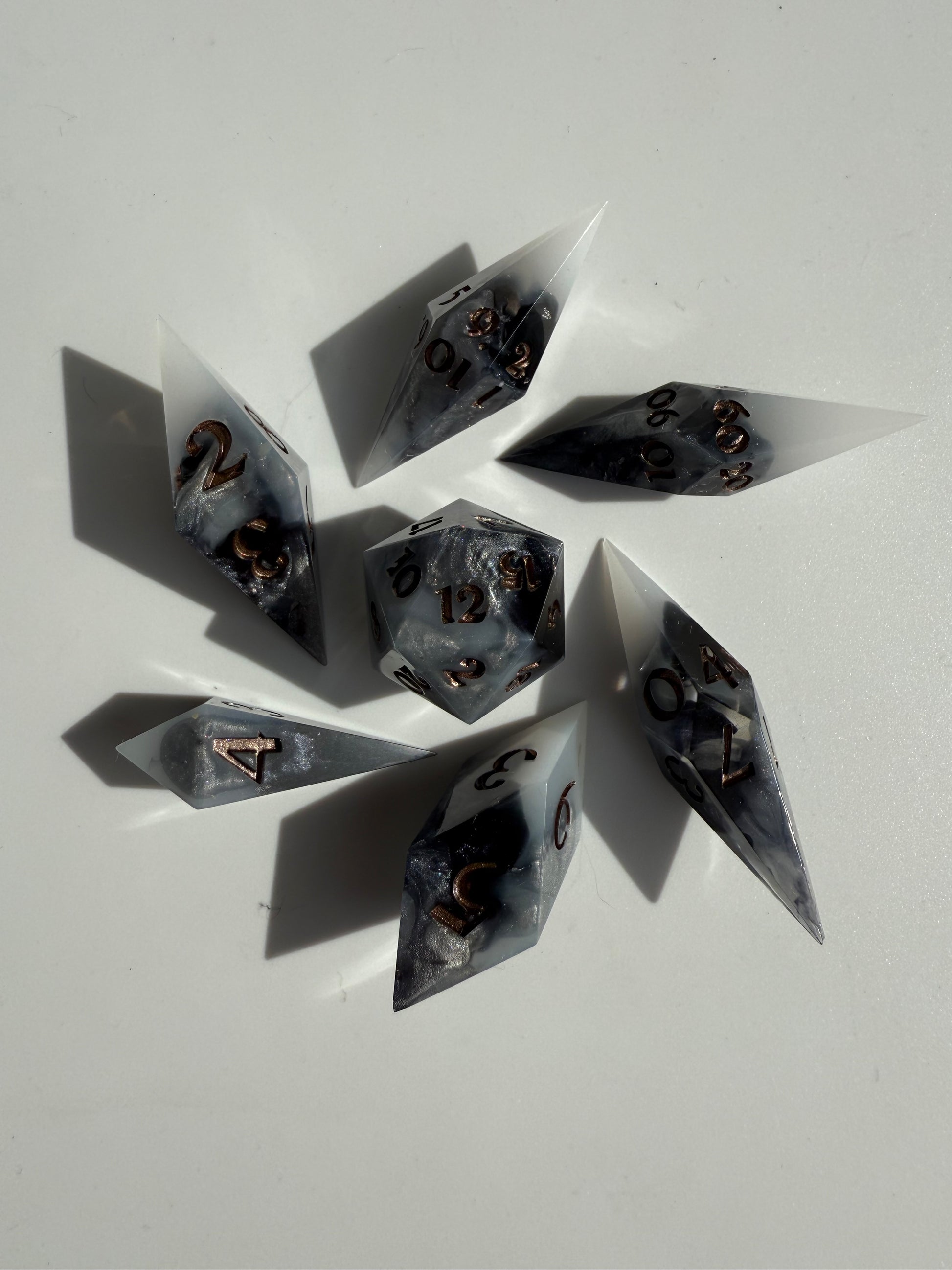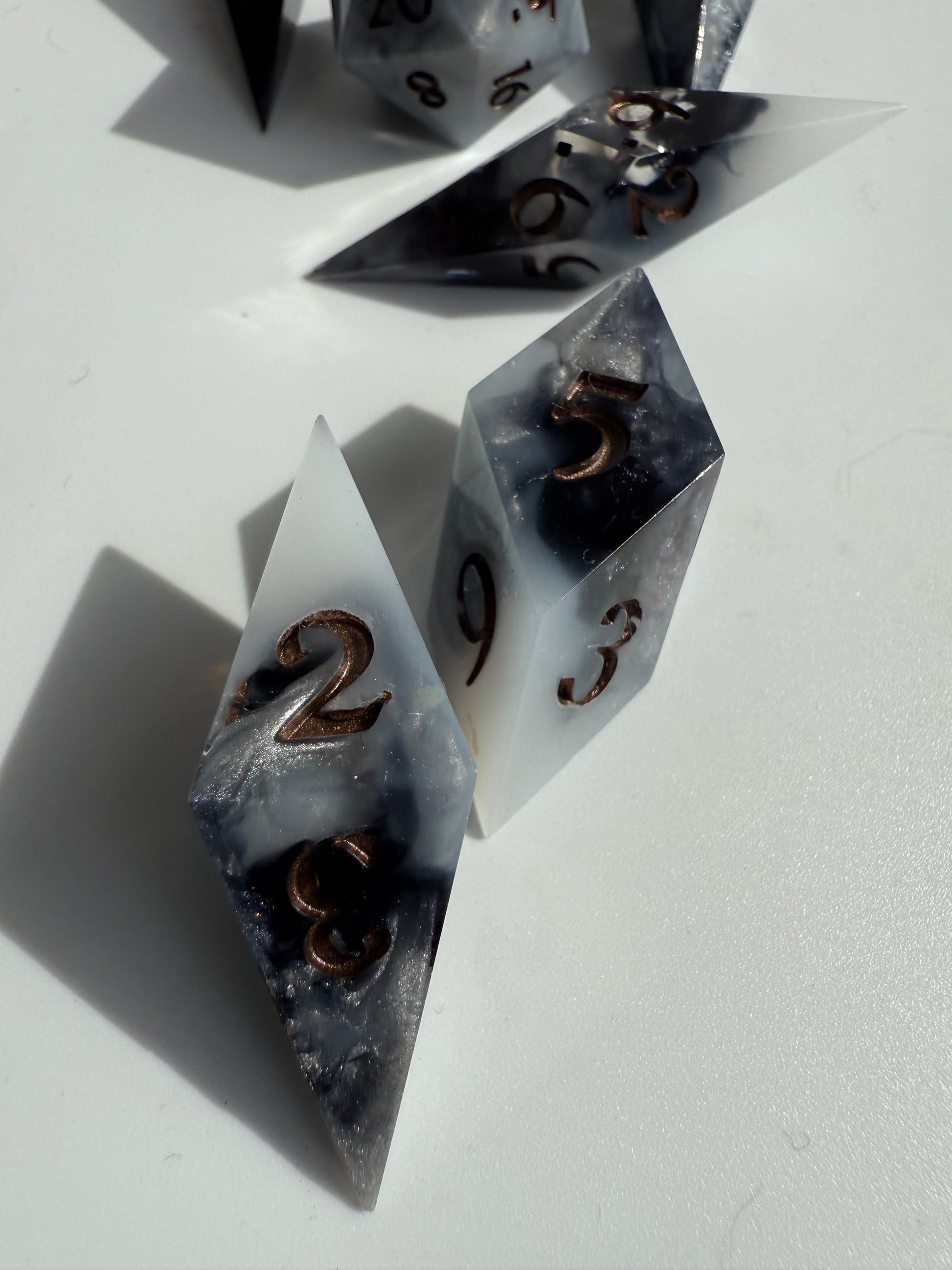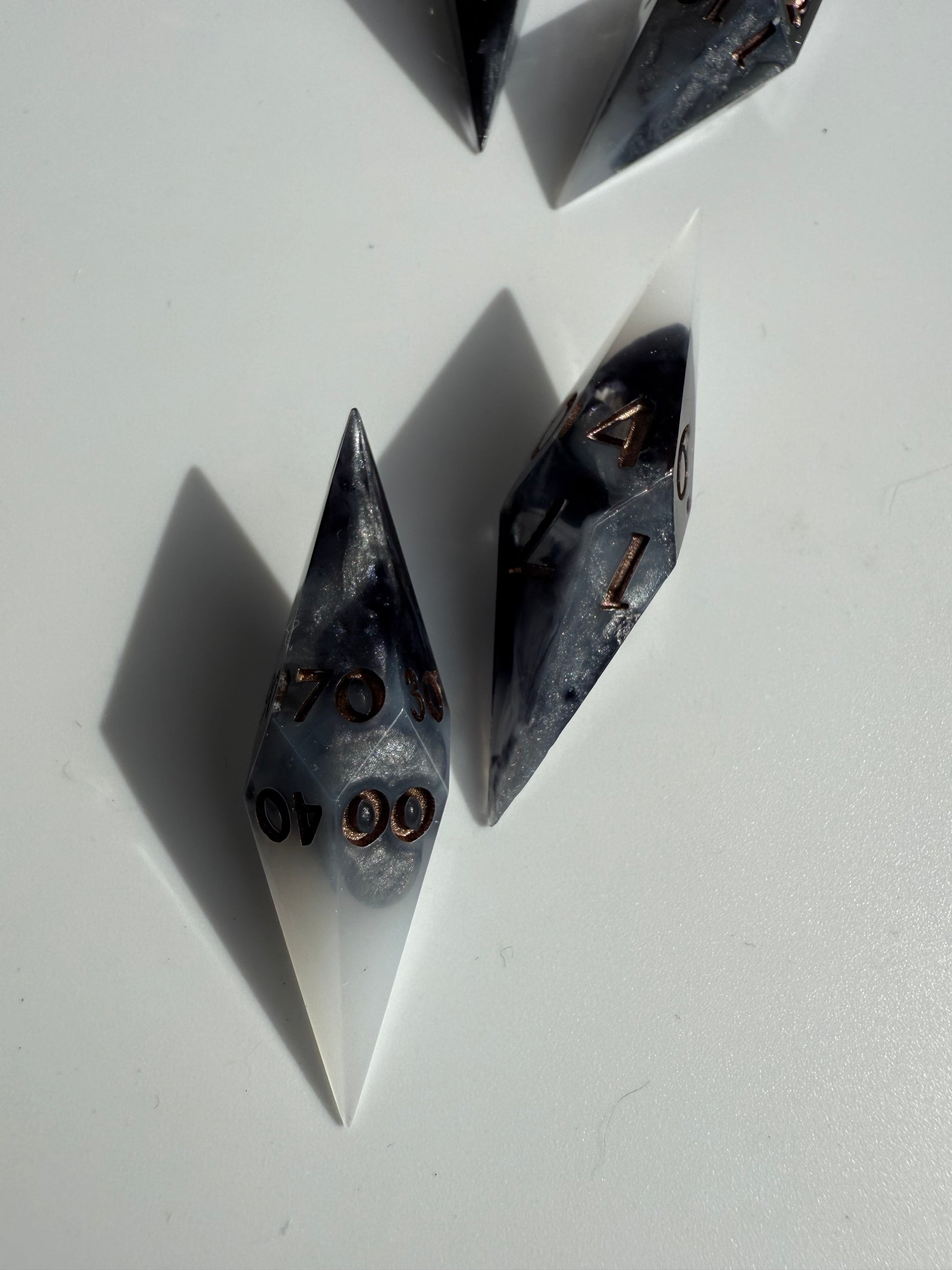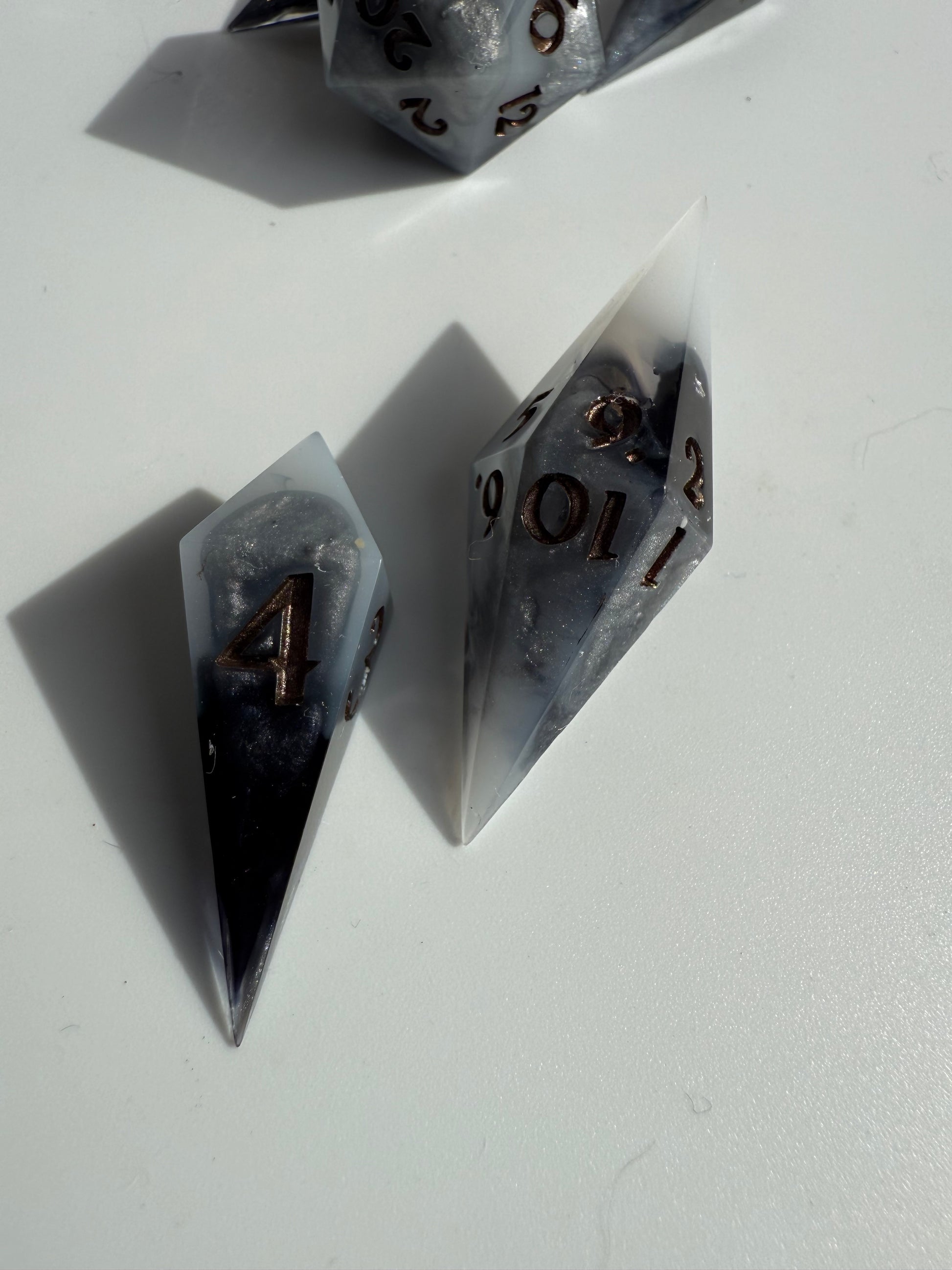 Set of 7 sharp-edge shard dice. Features a black and white base with clouds of silver. Inked in metallic brown.