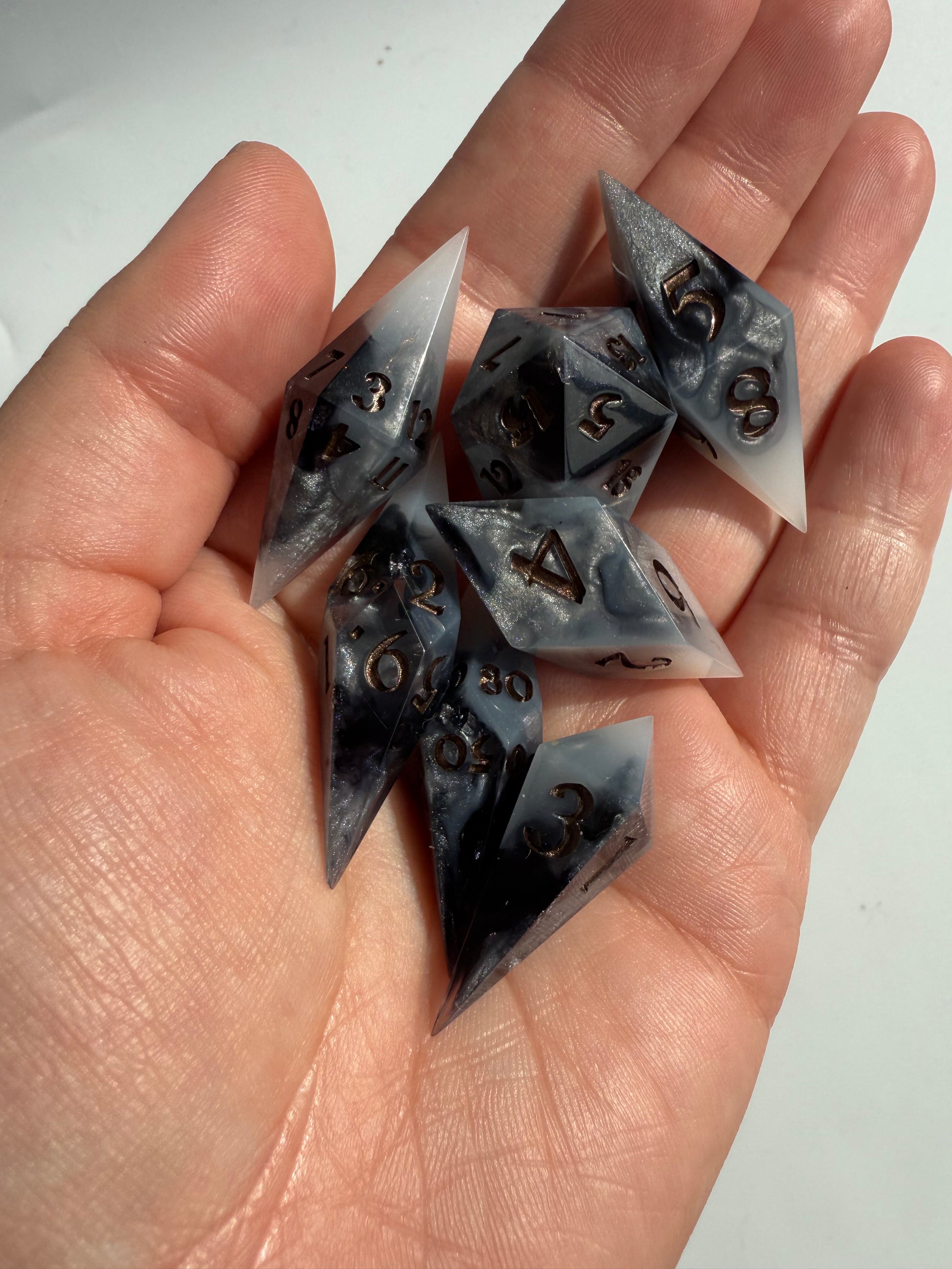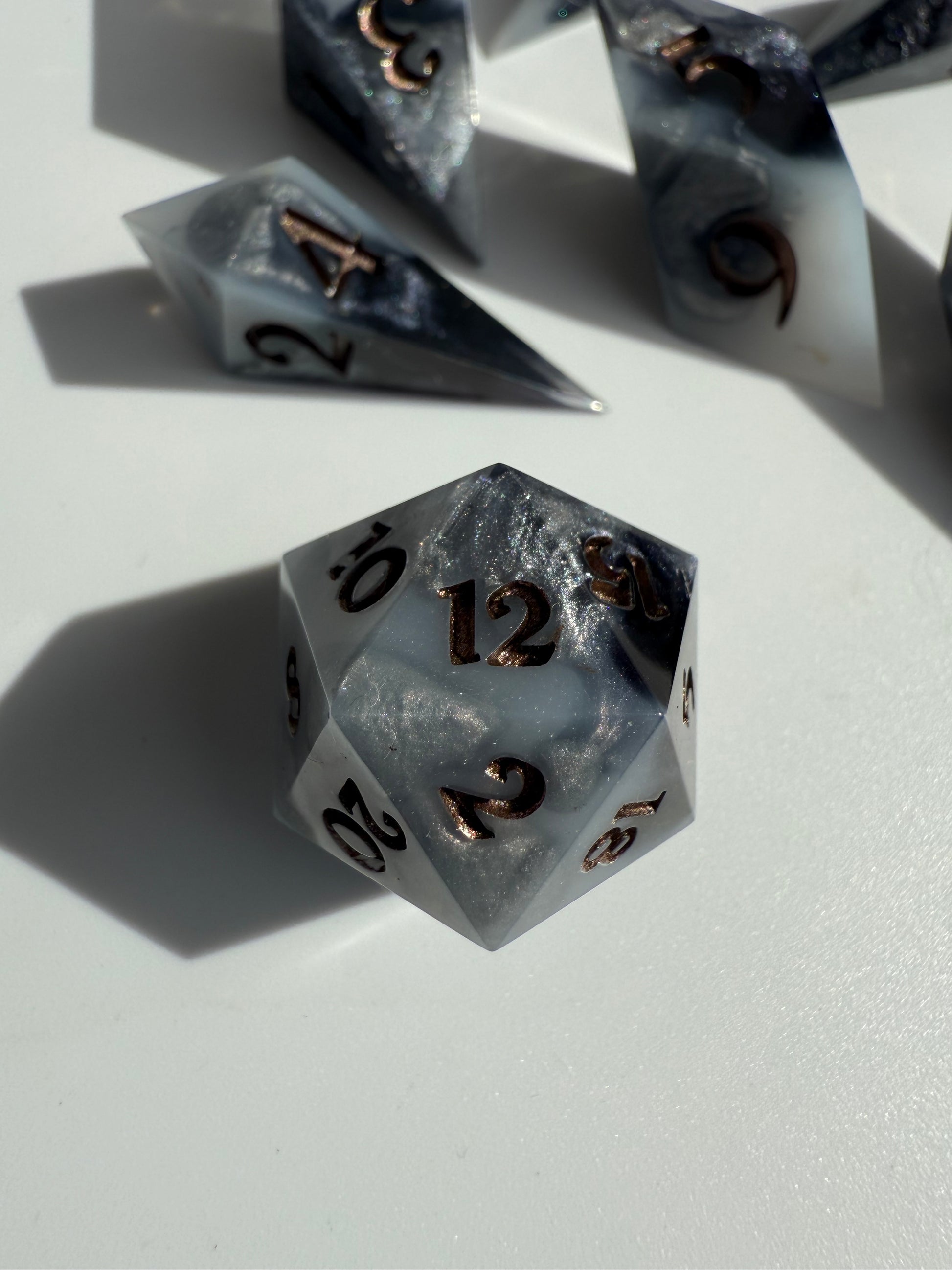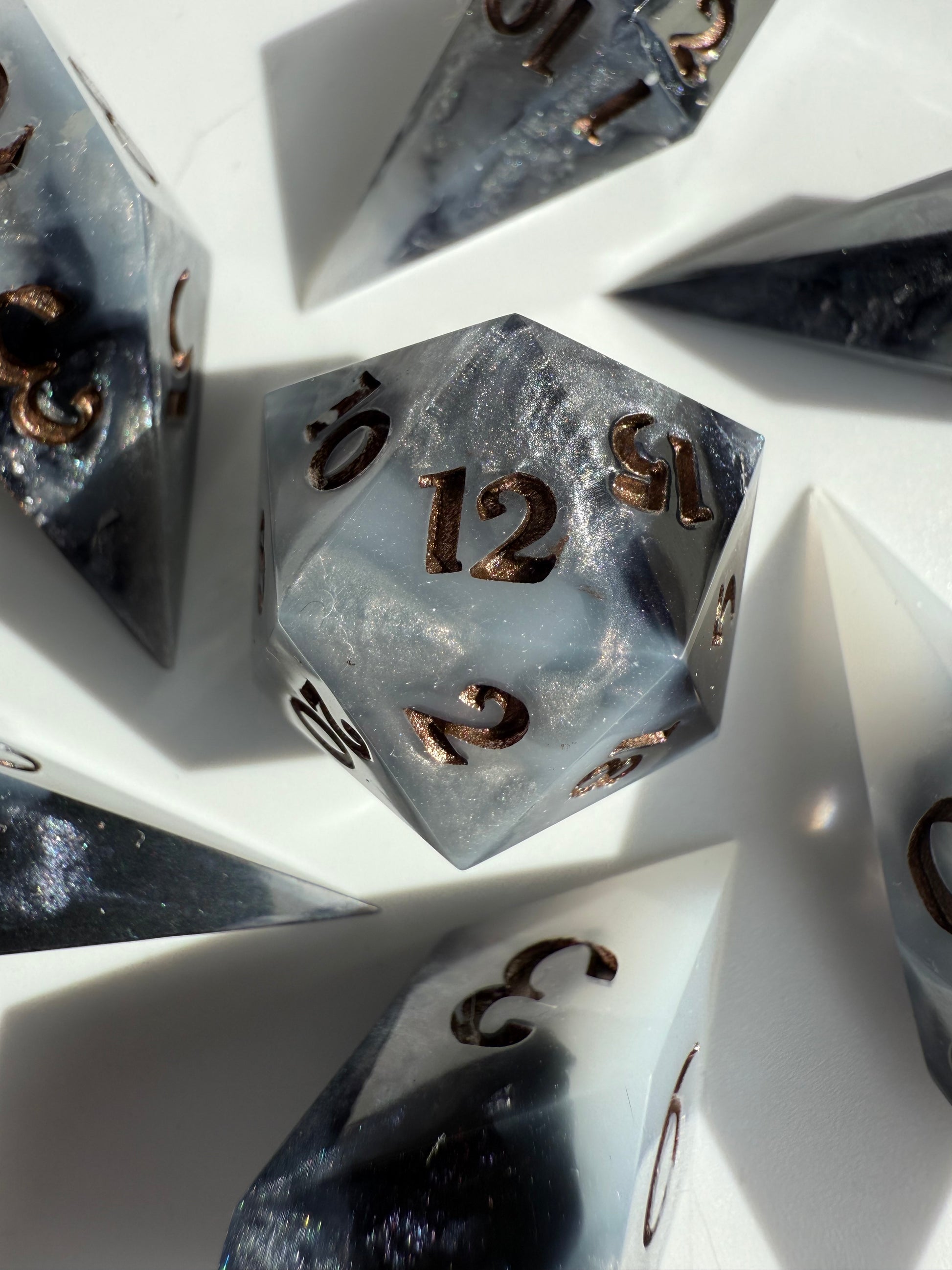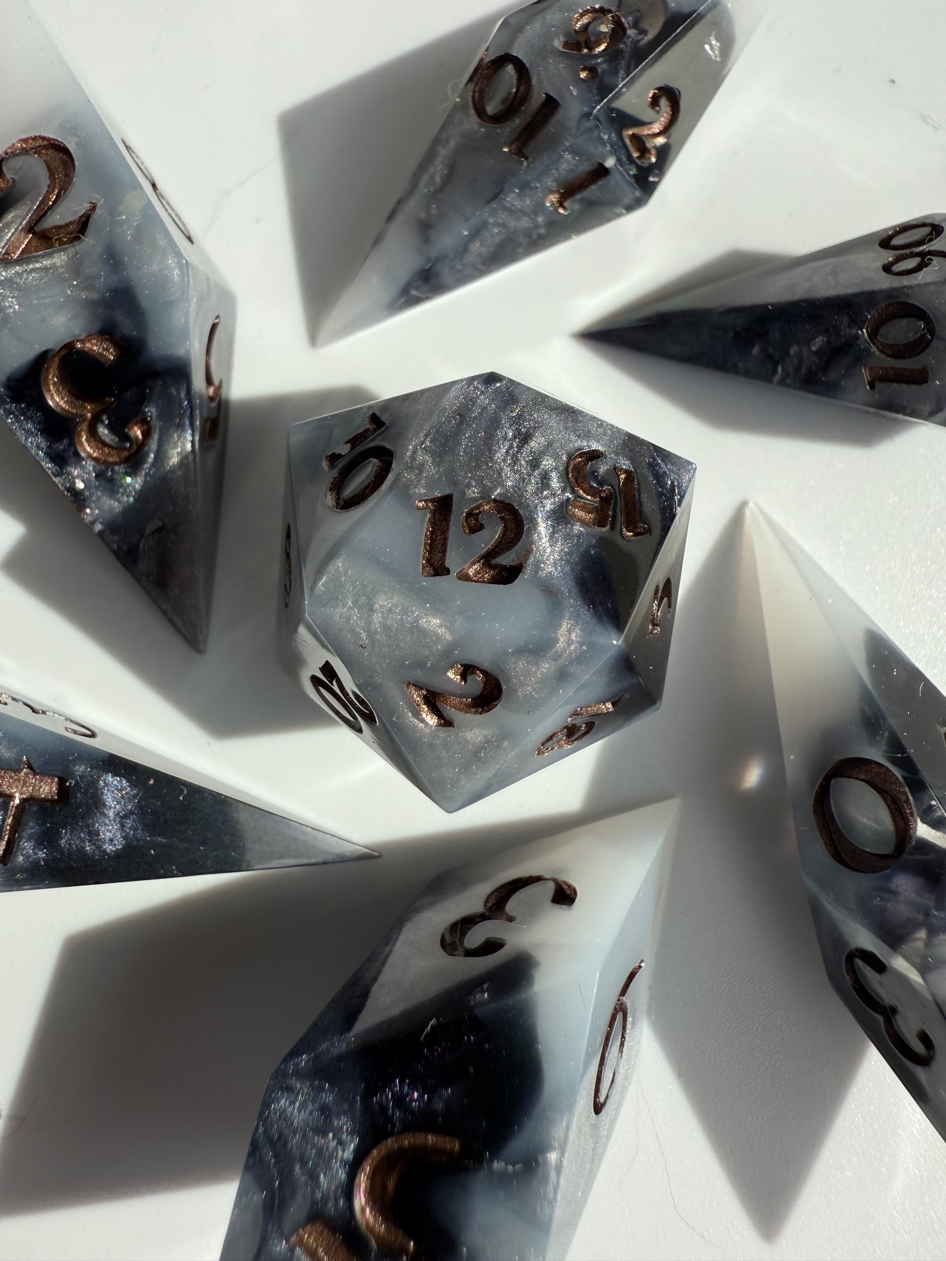 Set of 7 sharp-edge shard dice. Features a black and white base with clouds of silver. Inked in metallic brown.