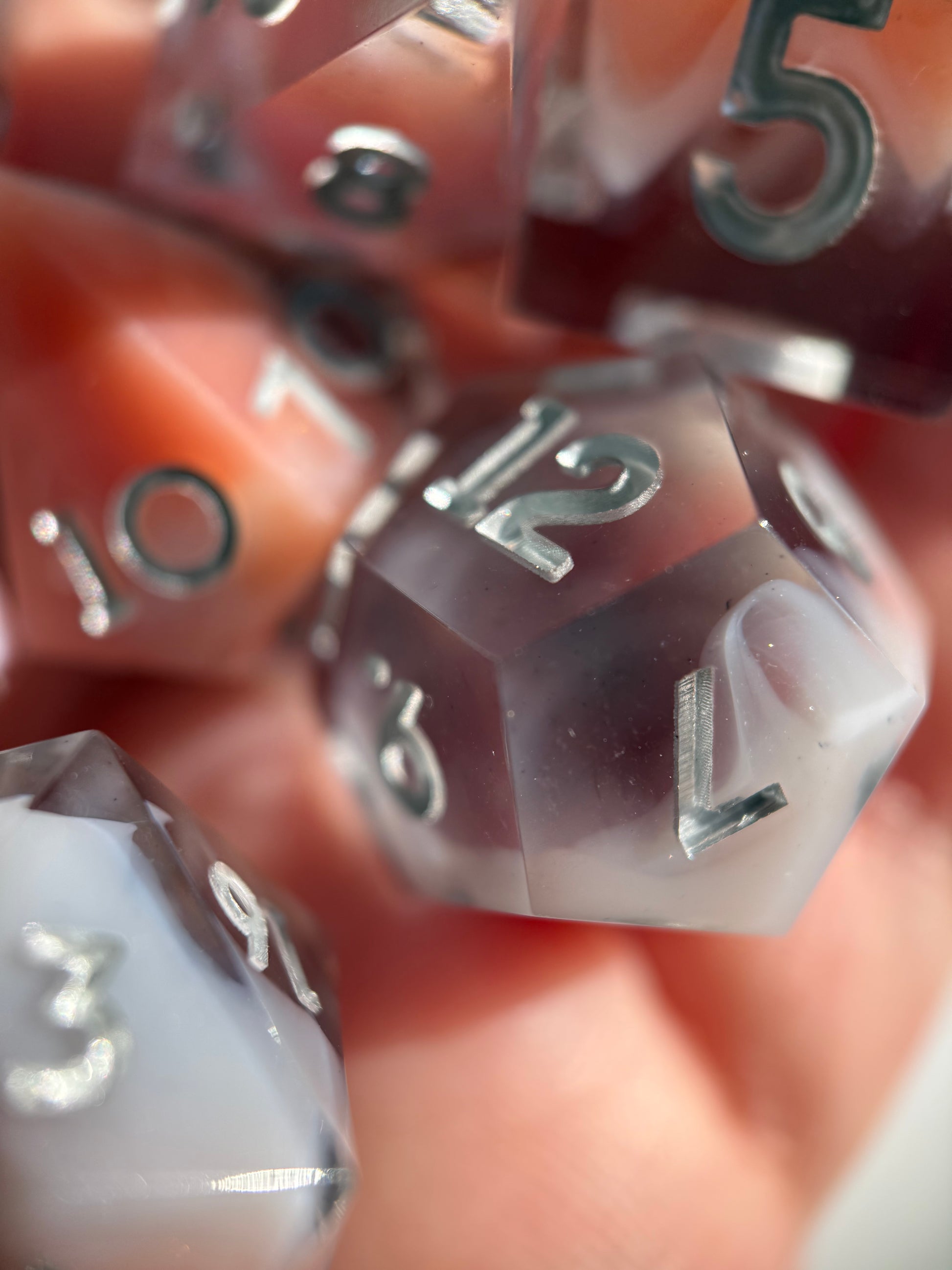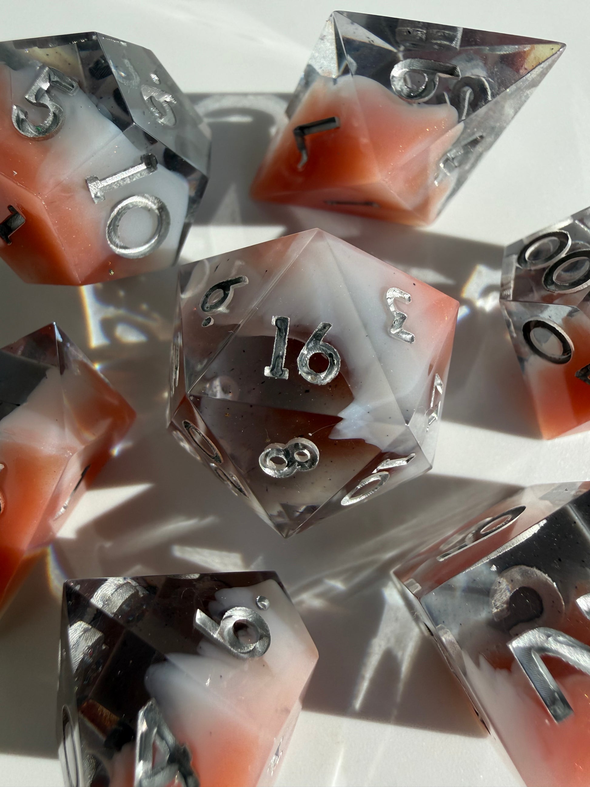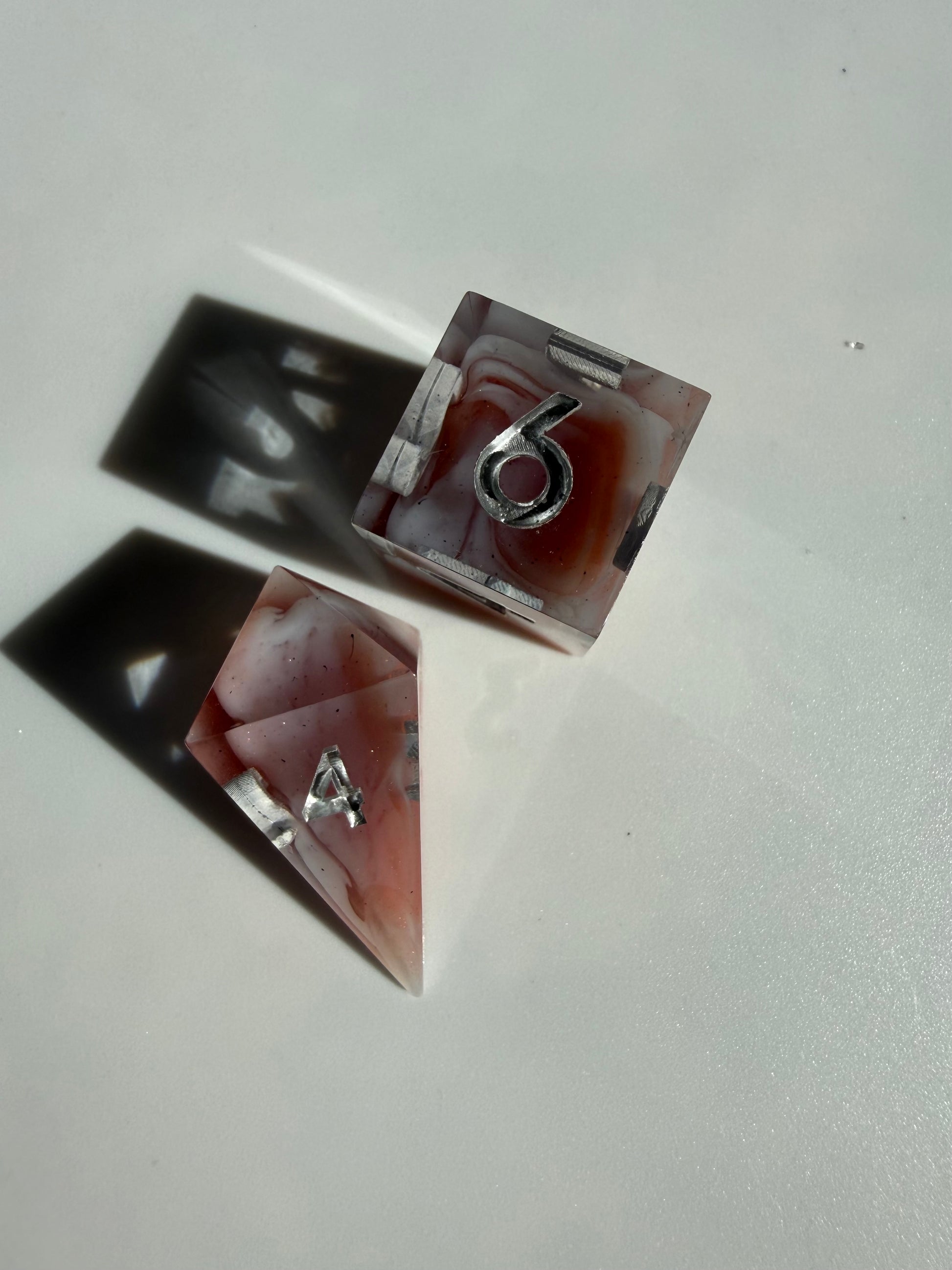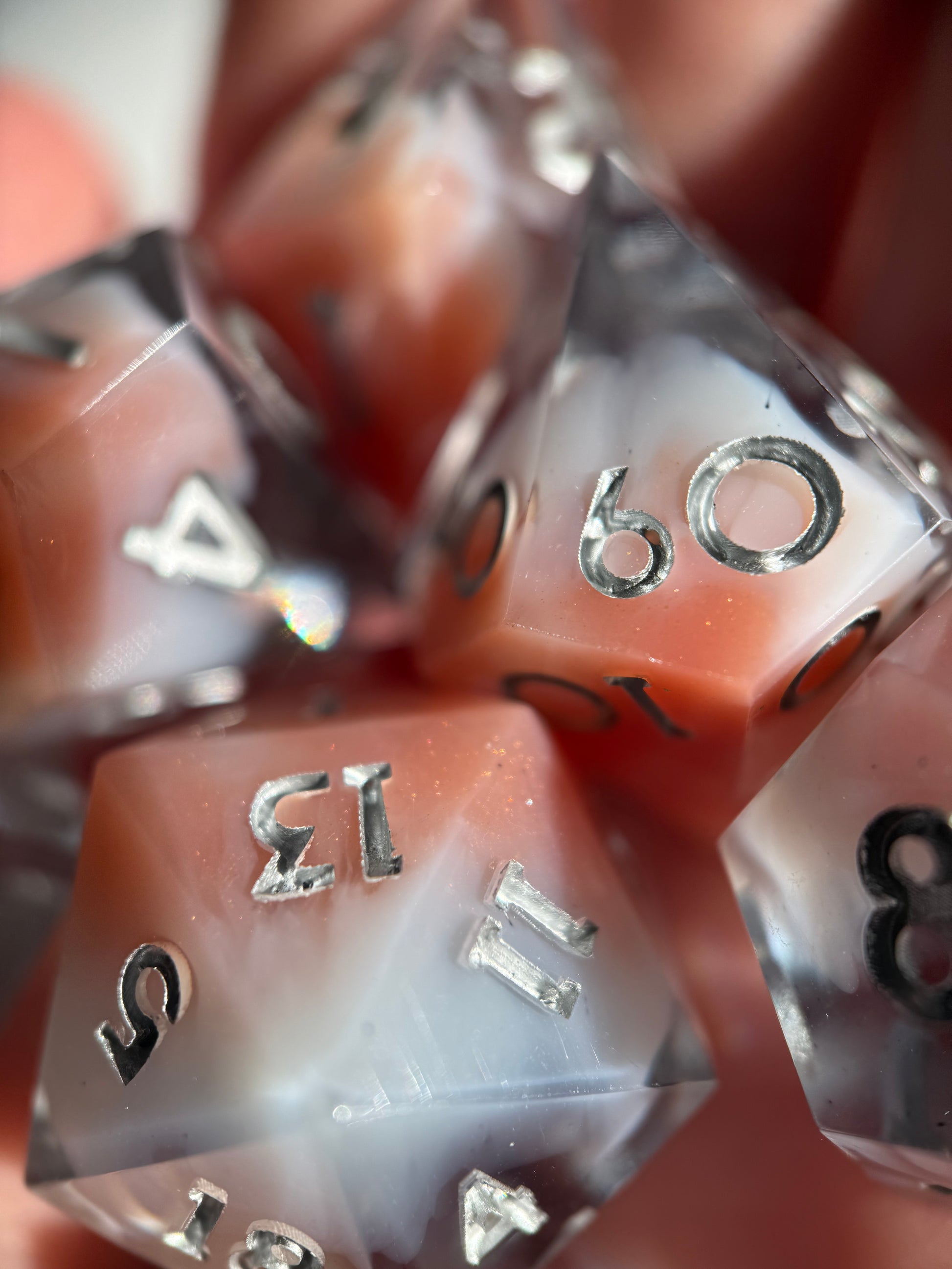 Set of 7 sharp-edge standard dice. Features a translucent grey base with layers of white and shimmering coral. Inked in silver.