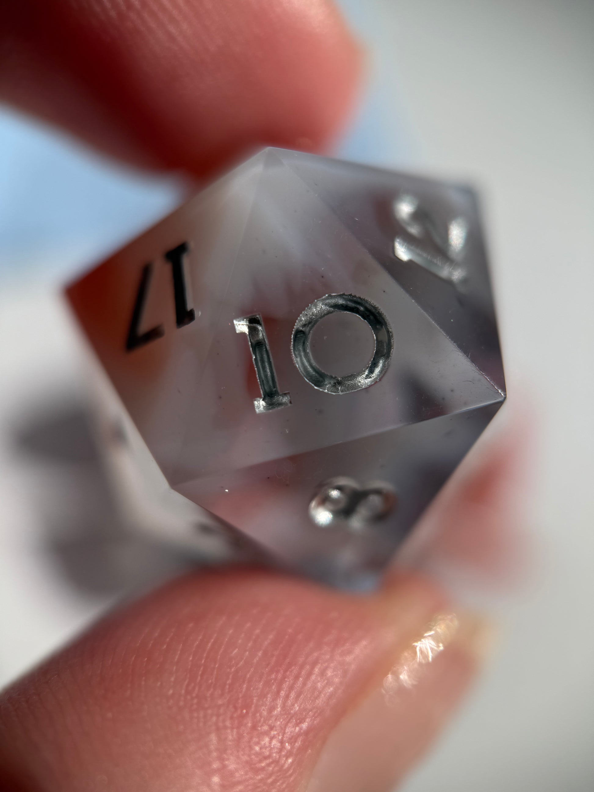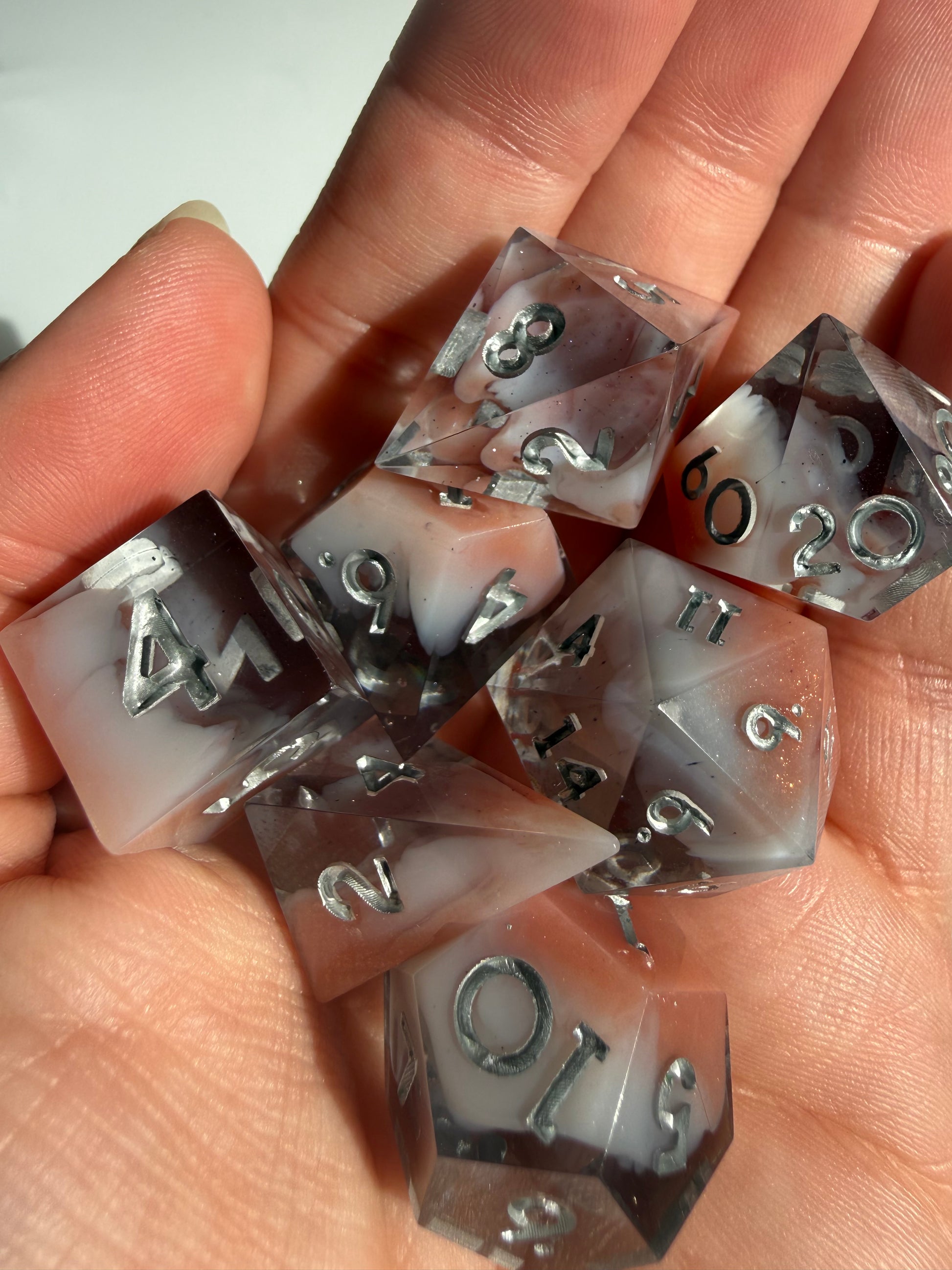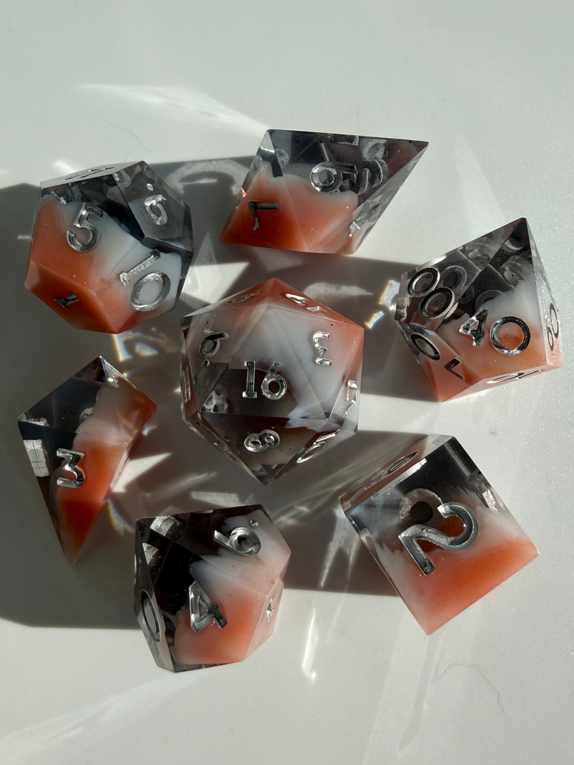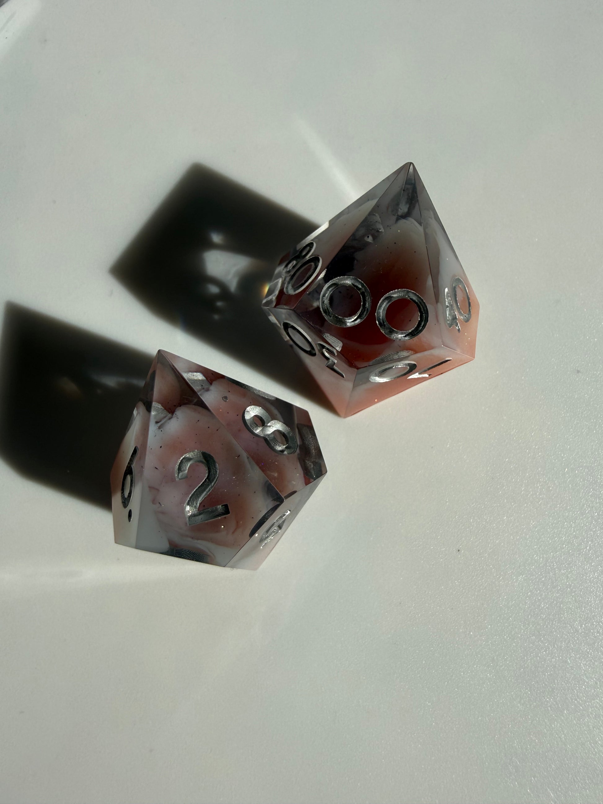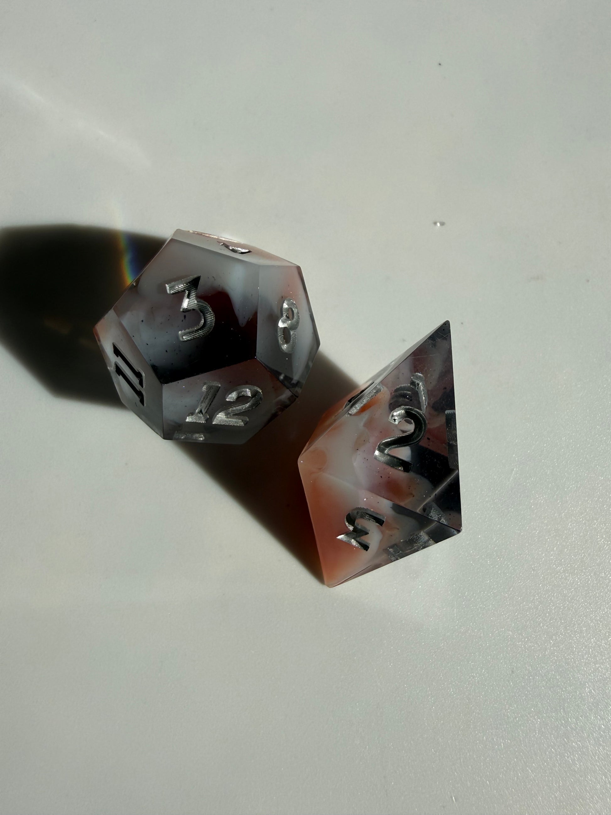 Set of 7 sharp-edge standard dice. Features a translucent grey base with layers of white and shimmering coral. Inked in silver.