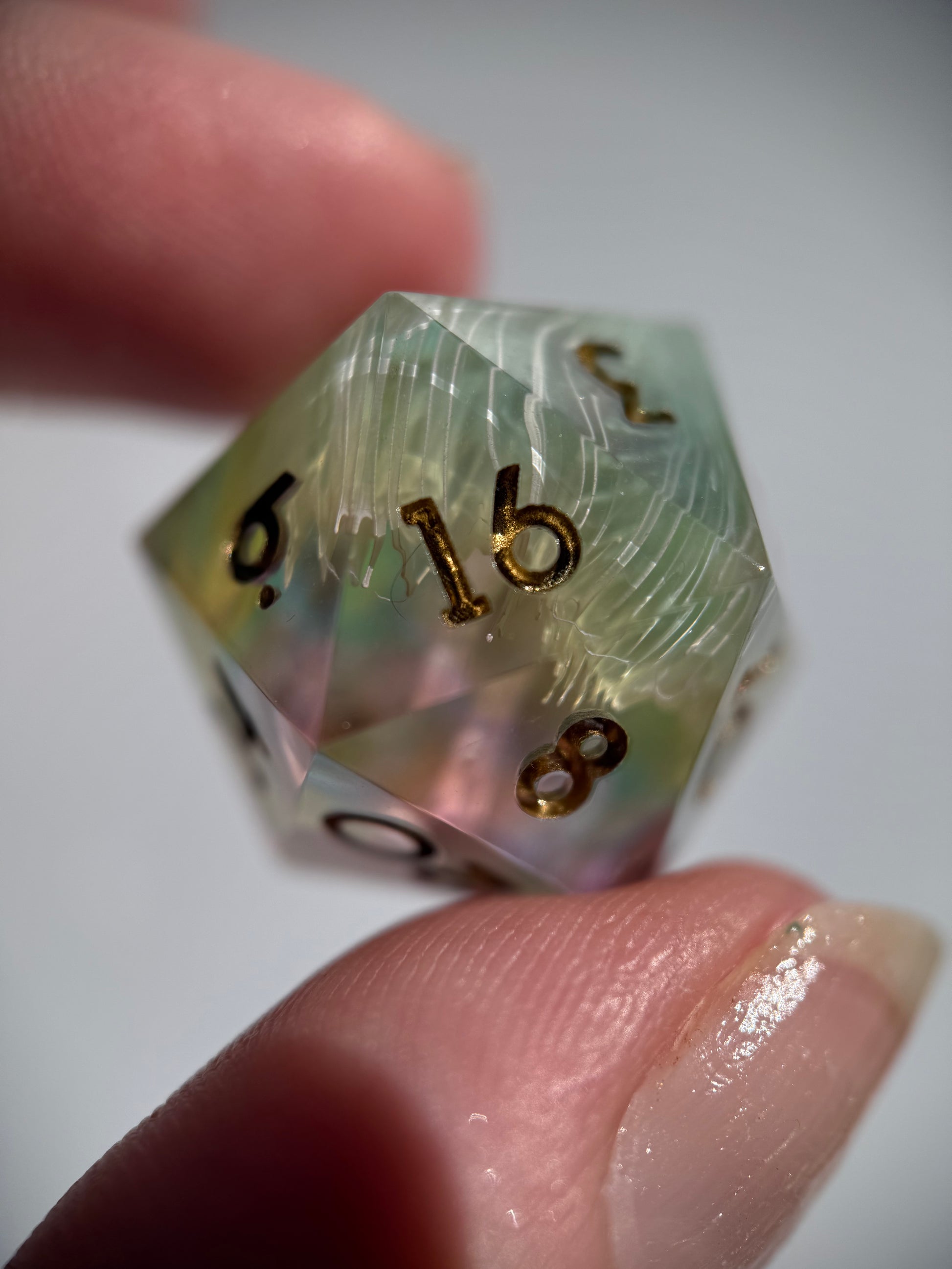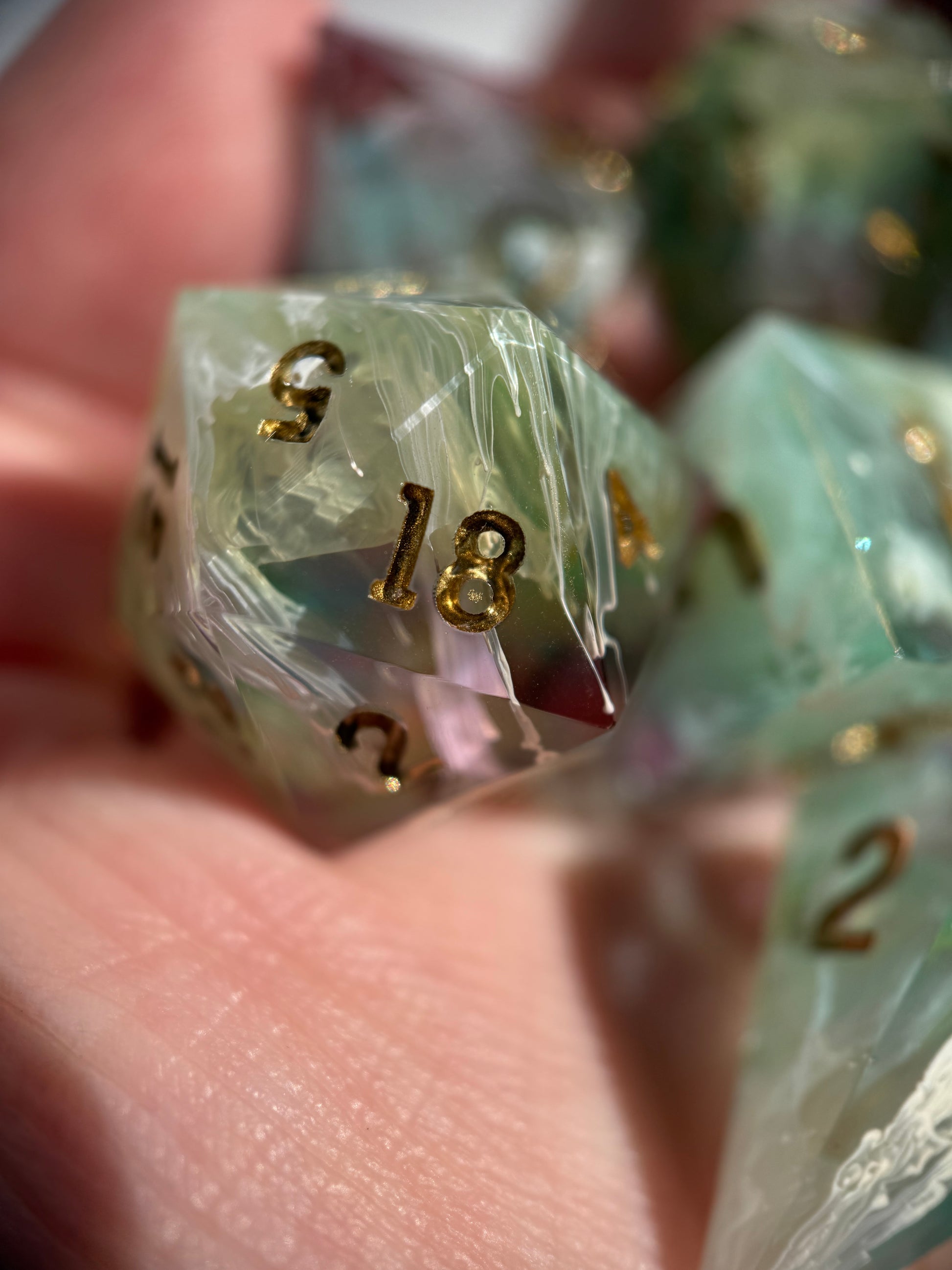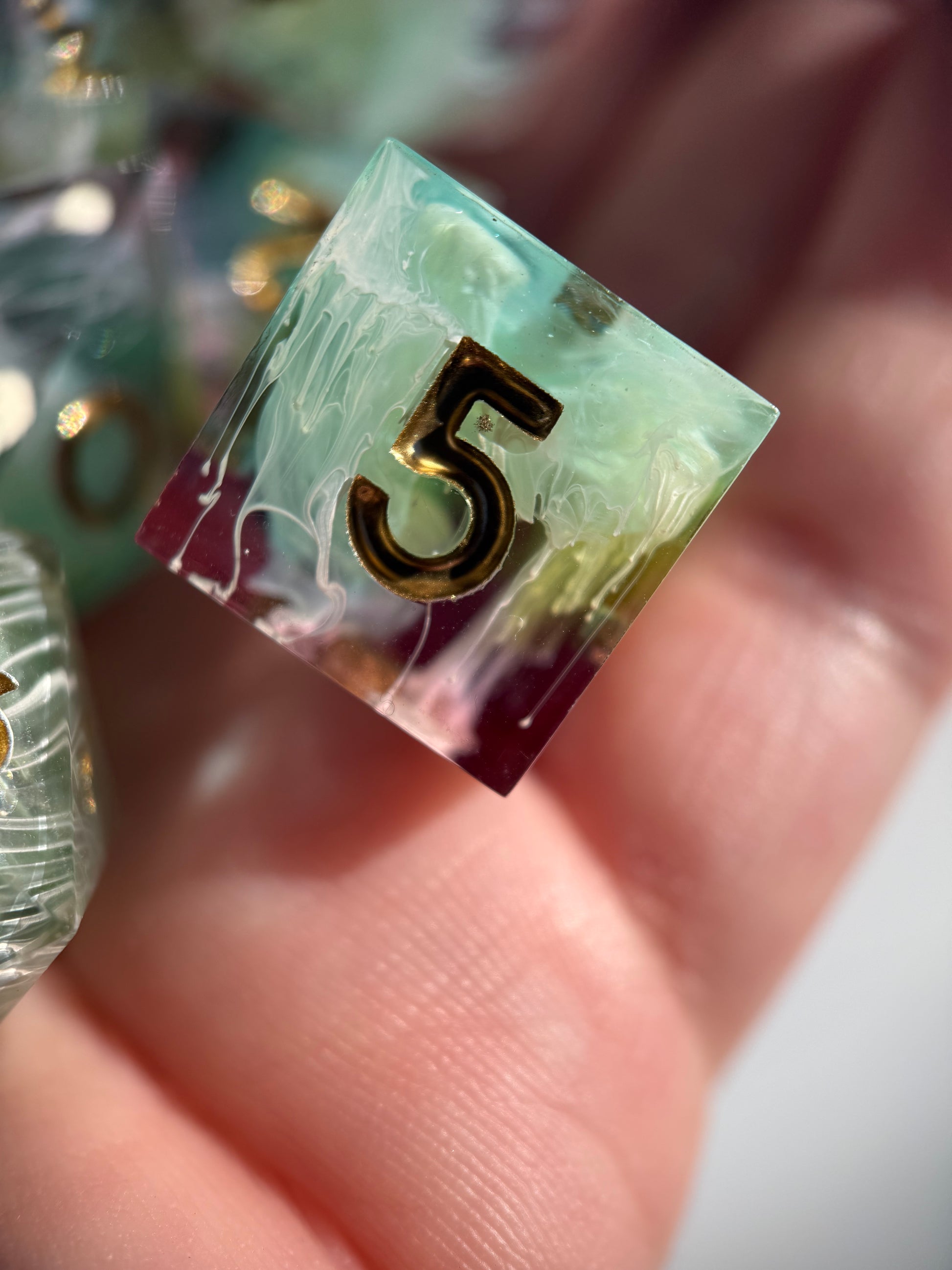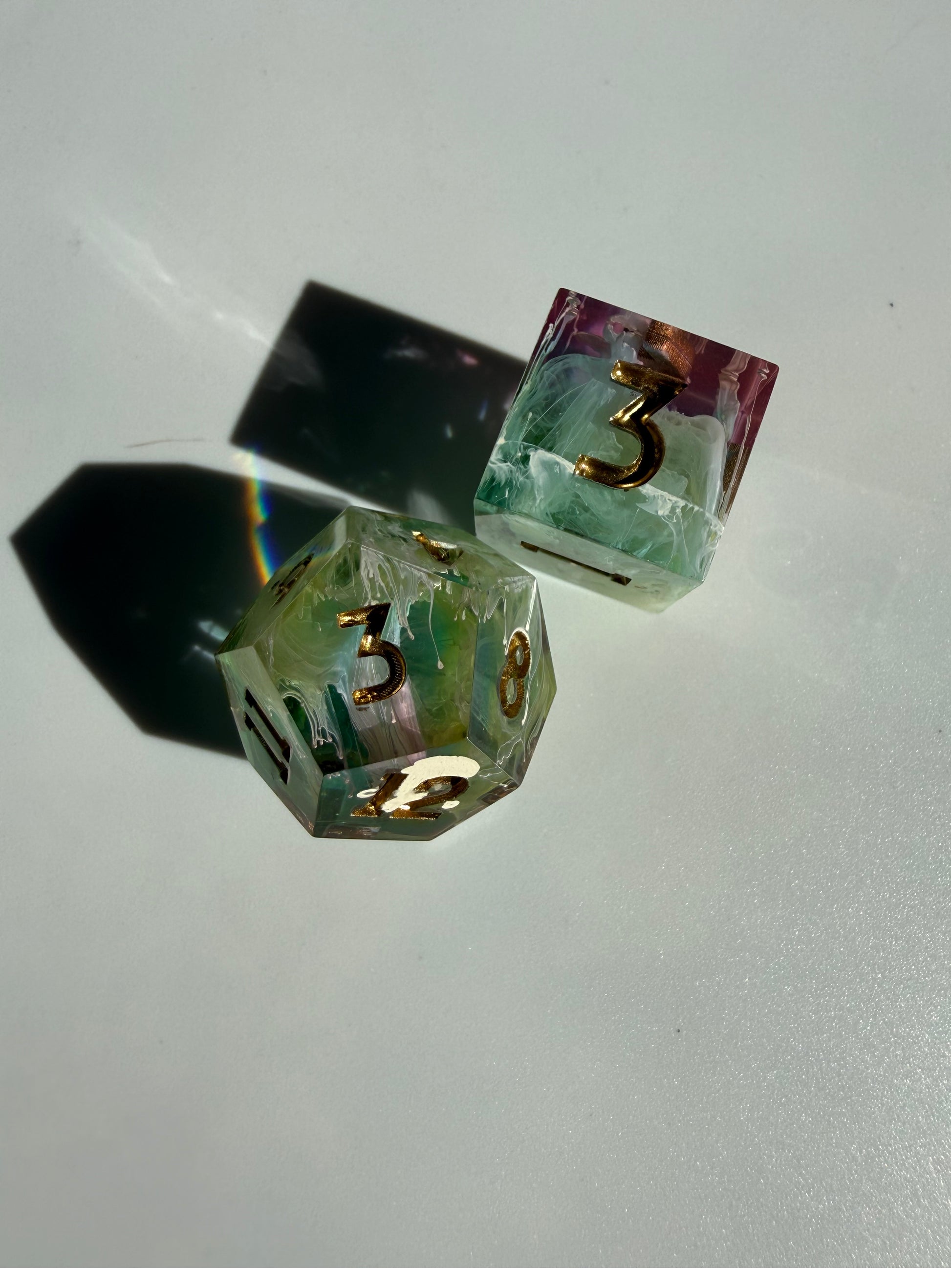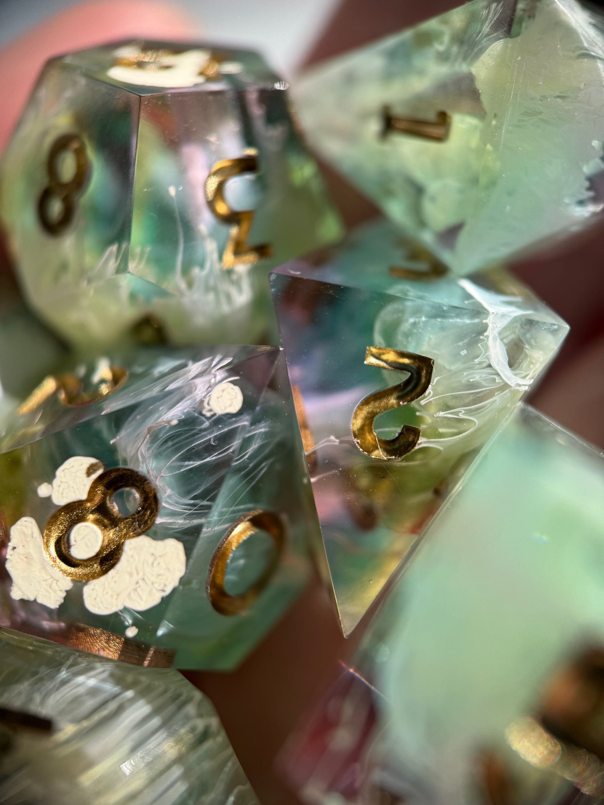 Set of 7 sharp-edge standard dice. Features a translucent pastel rainbow base with white ink petri. Inked in gold.