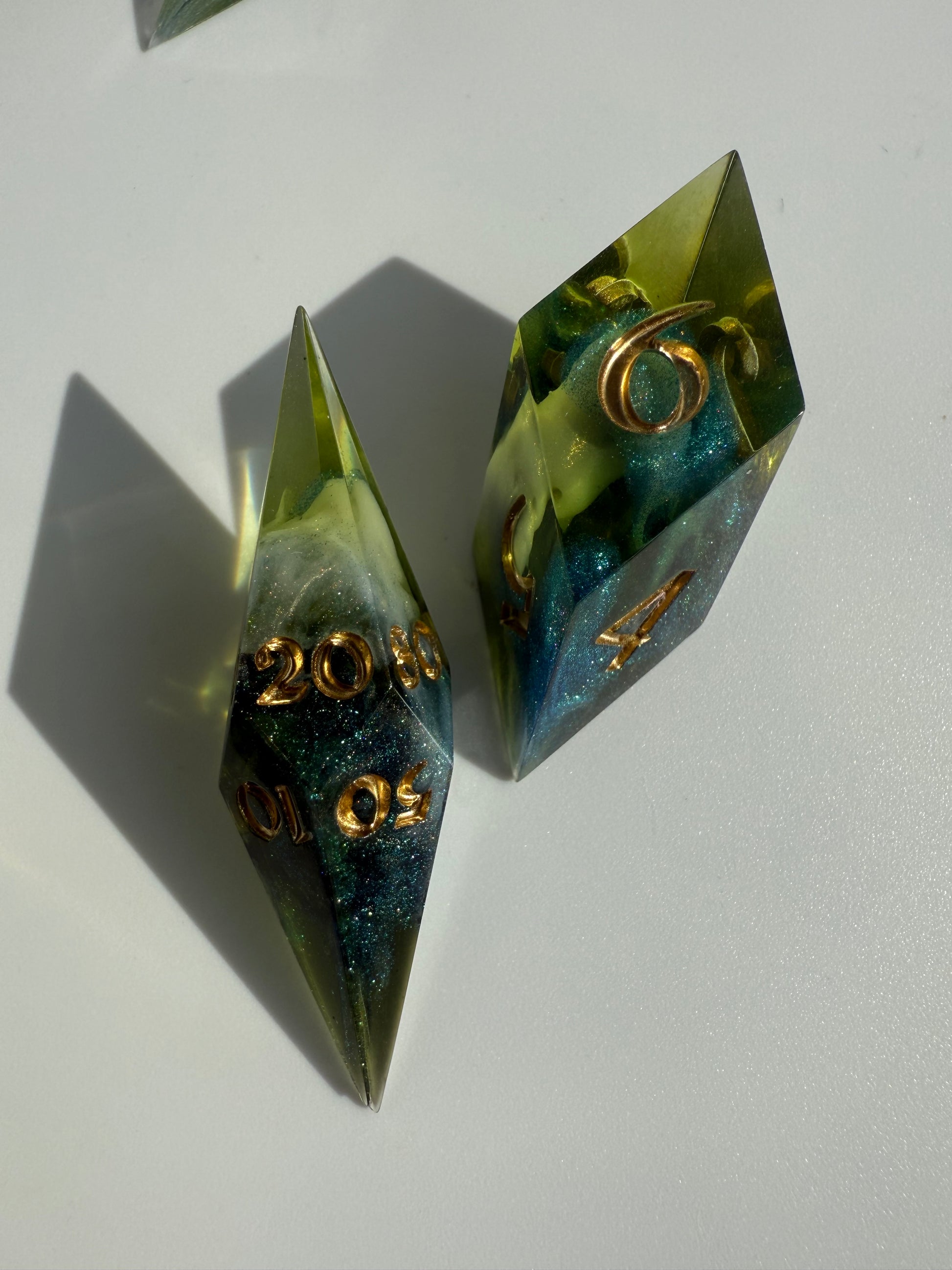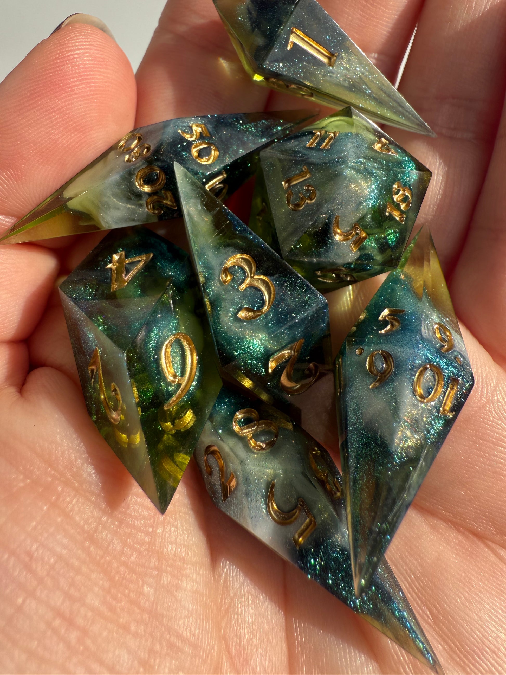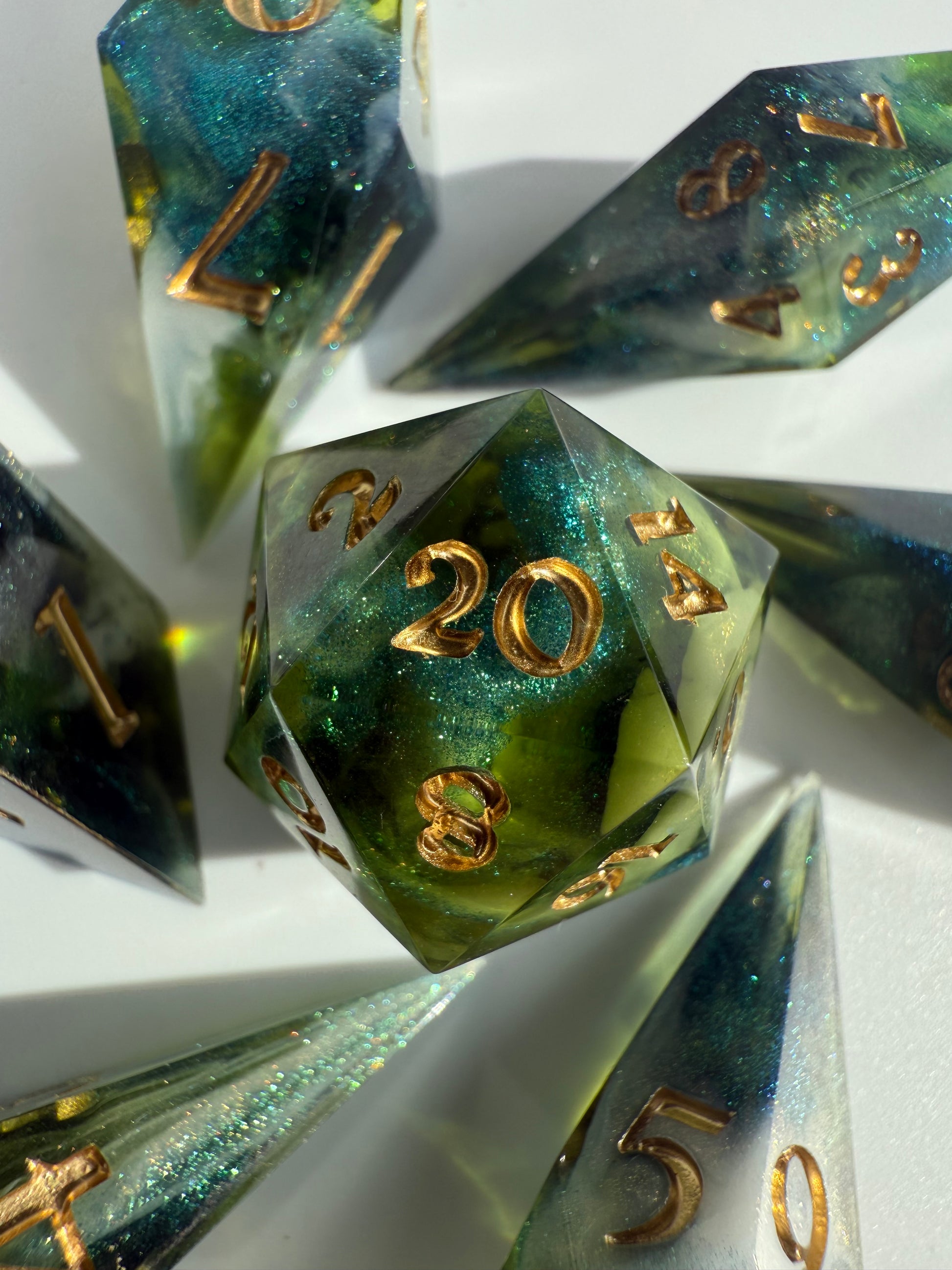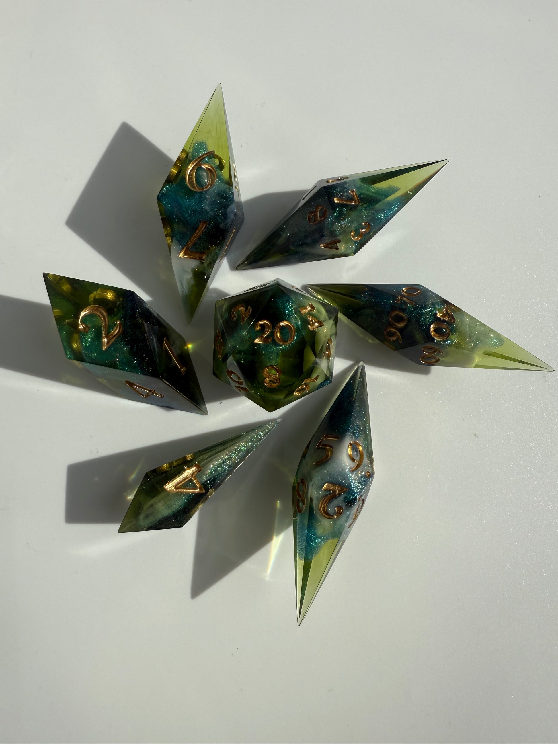 Set of 7 sharp-edge shard dice. Features a translucent green base with clouds of sparkling white and blue-green color-shifting shimmer. Inked in gold.