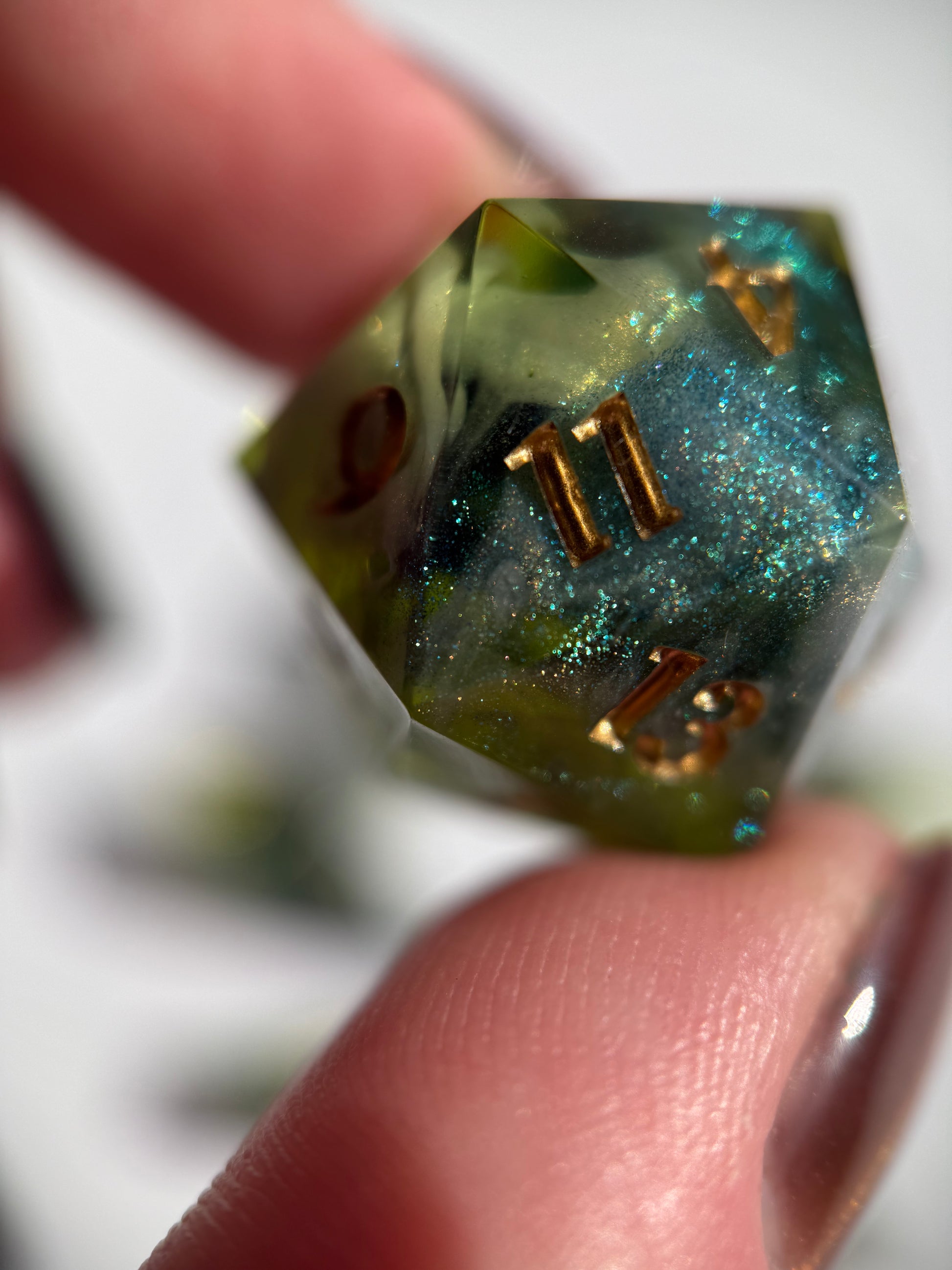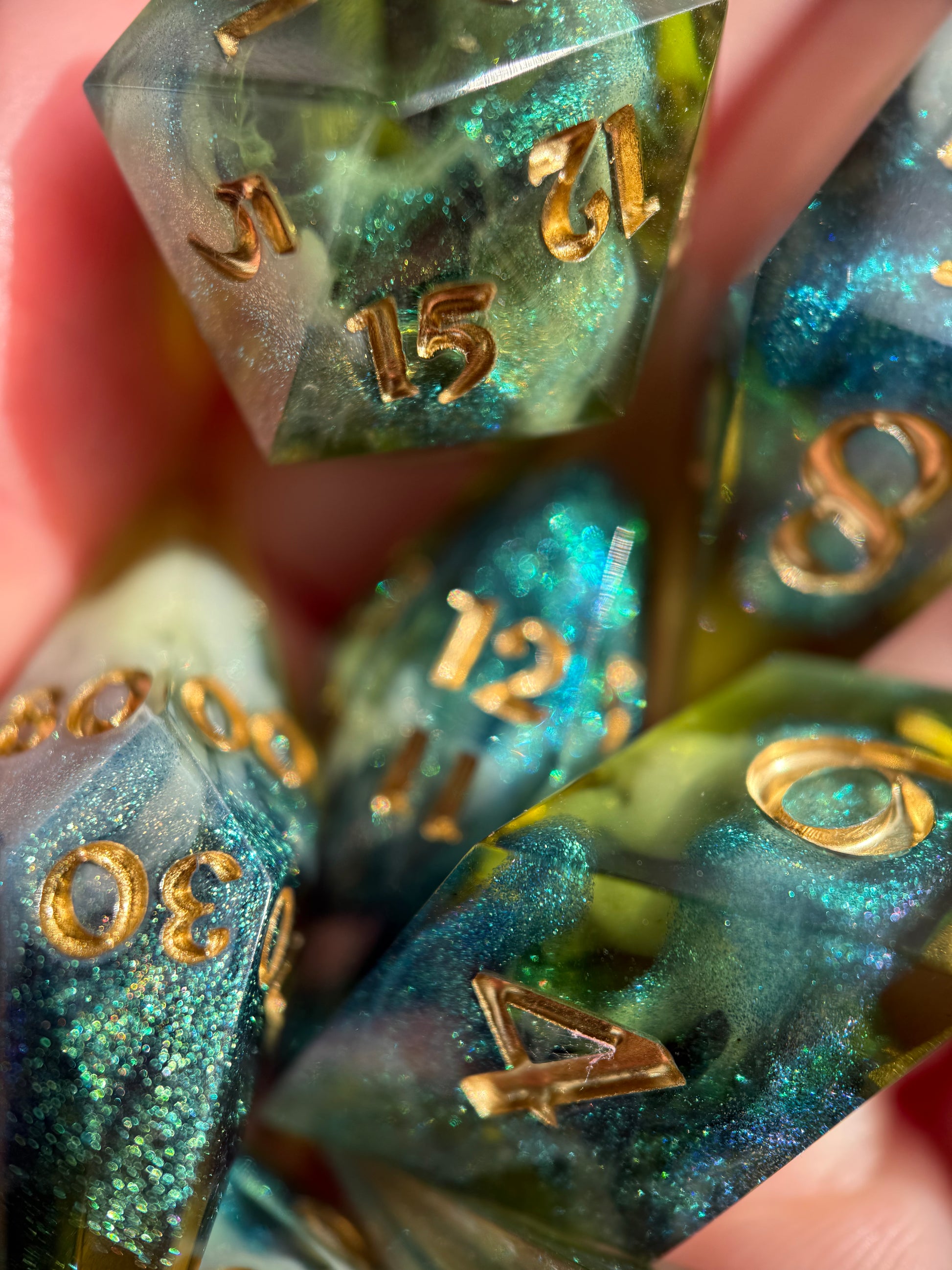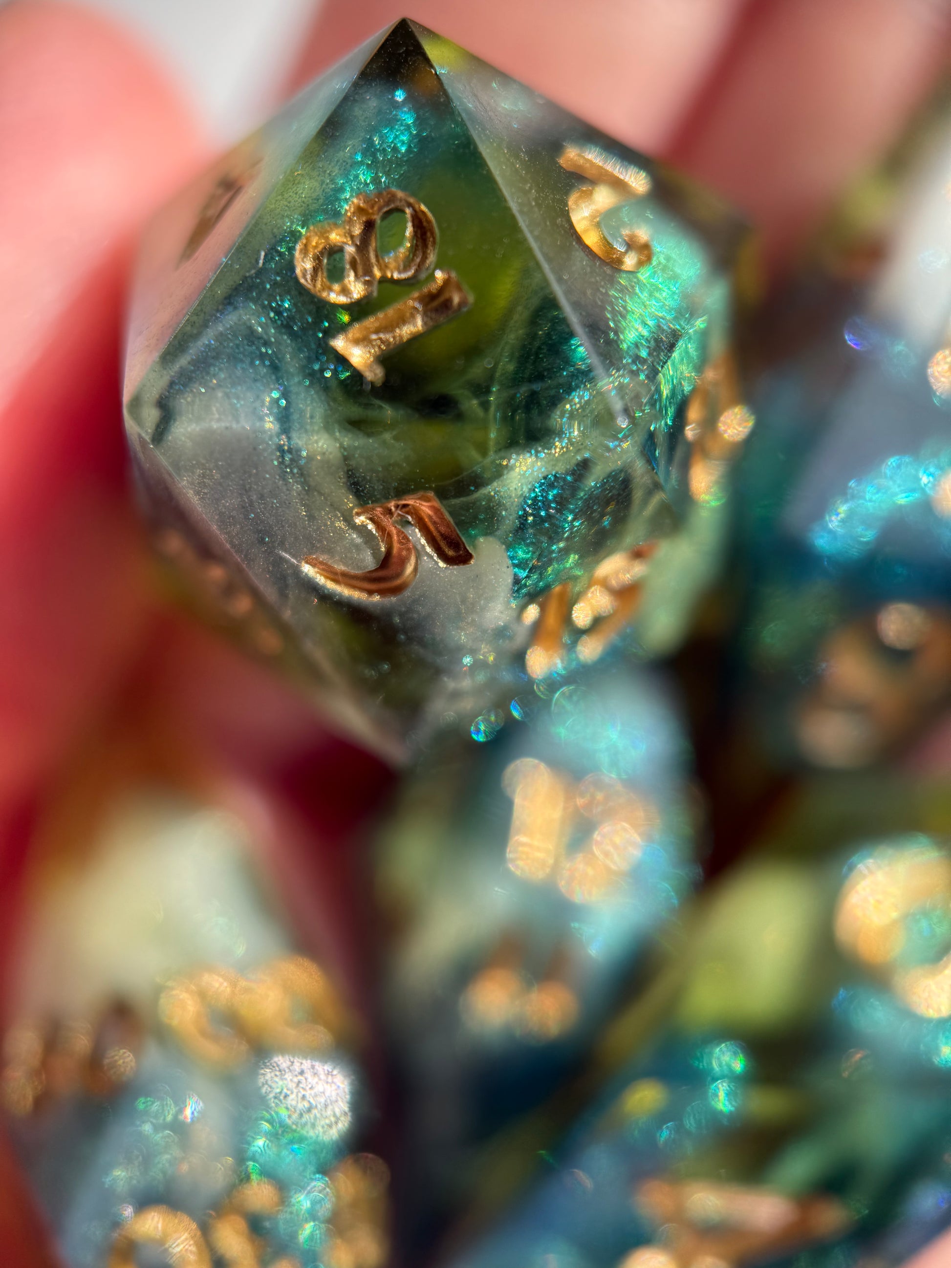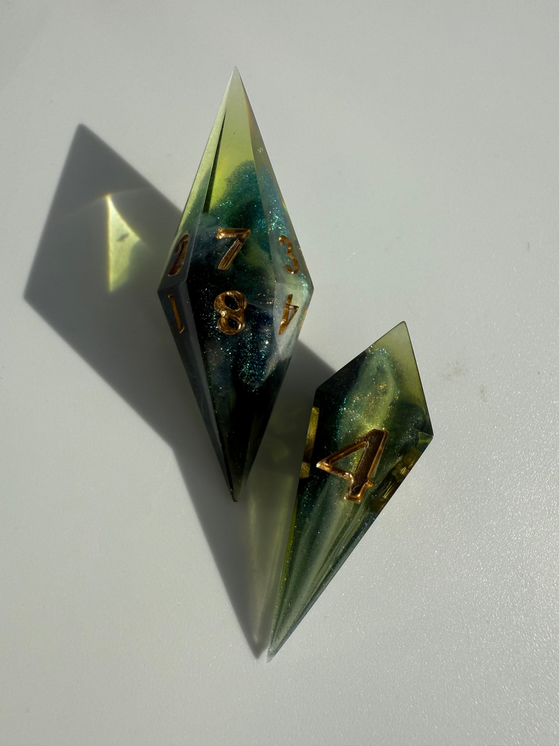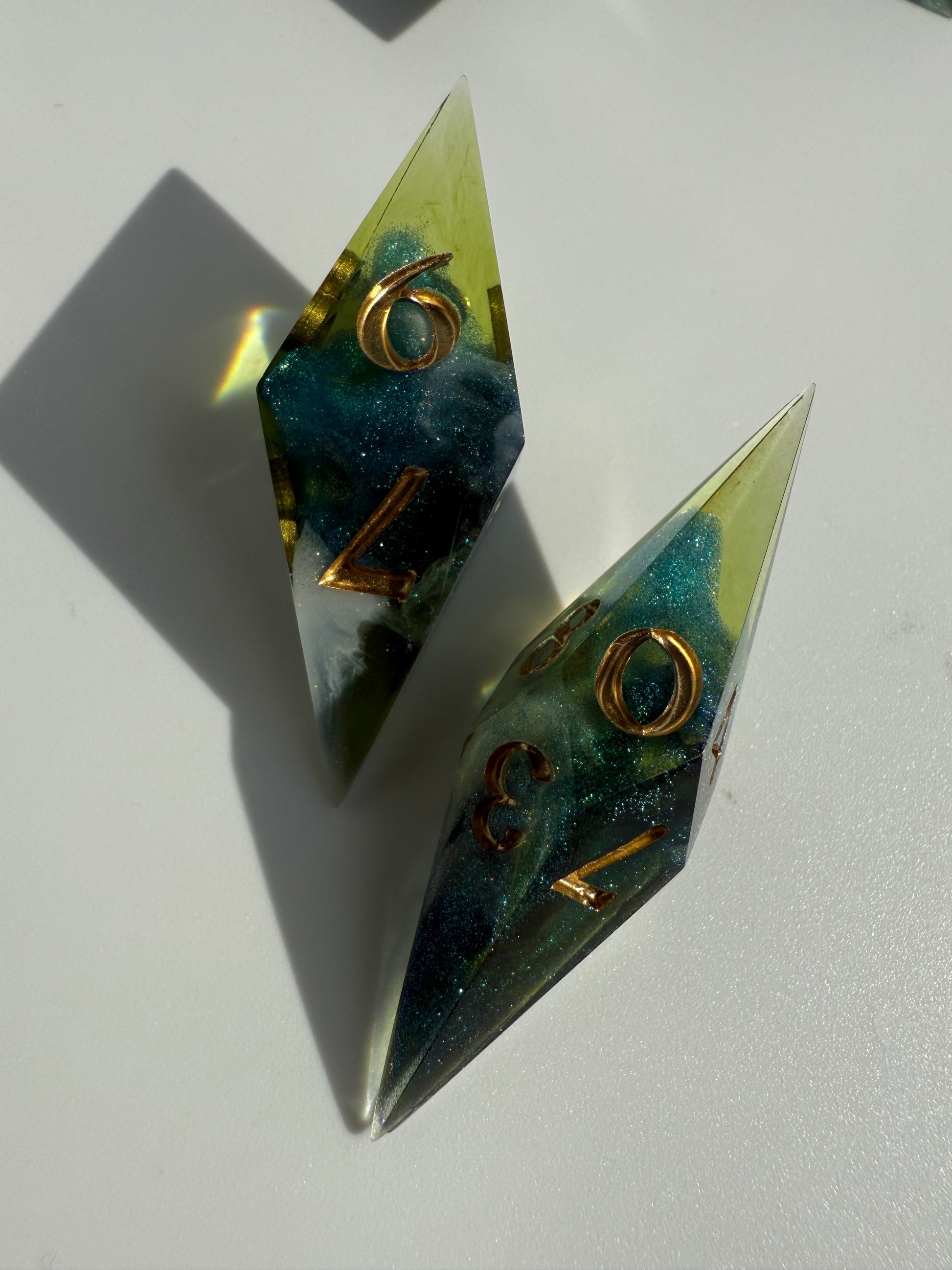 Set of 7 sharp-edge shard dice. Features a translucent green base with clouds of sparkling white and blue-green color-shifting shimmer. Inked in gold.